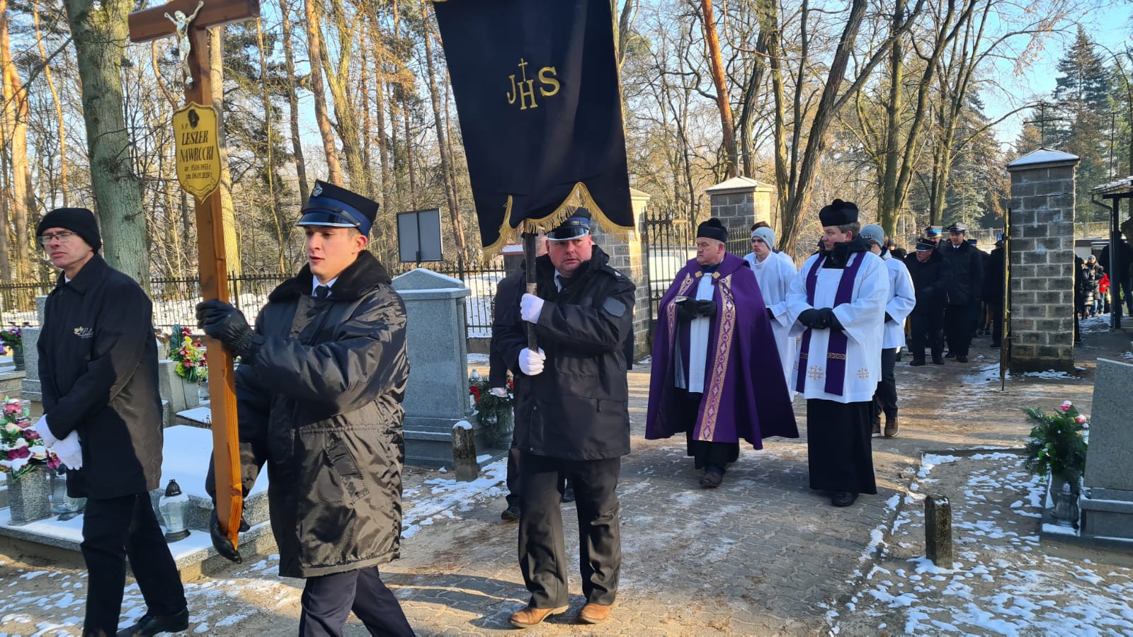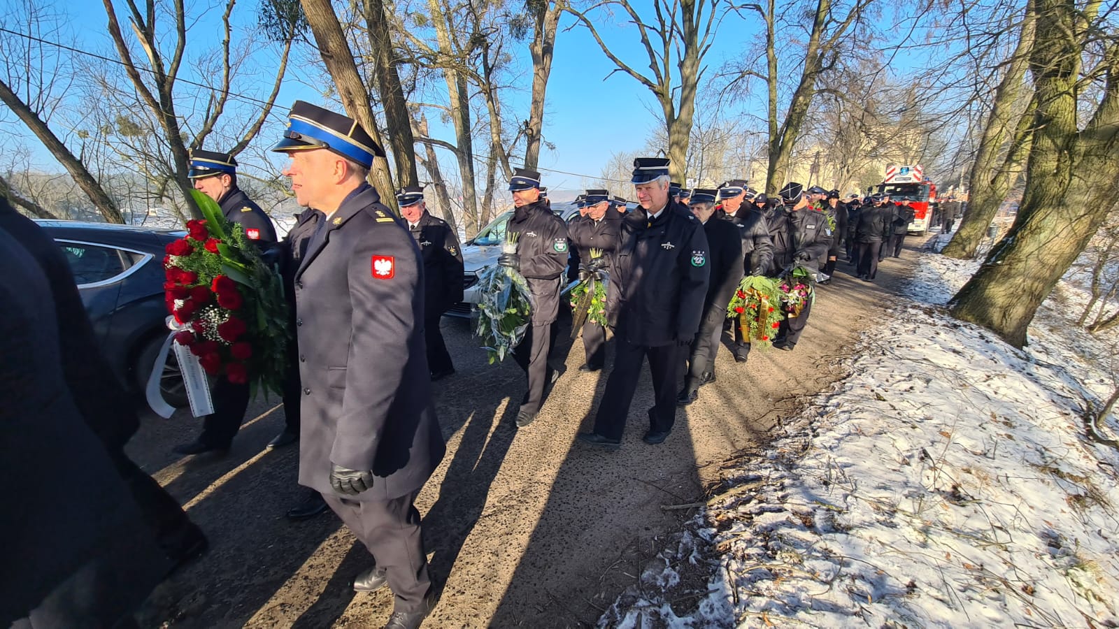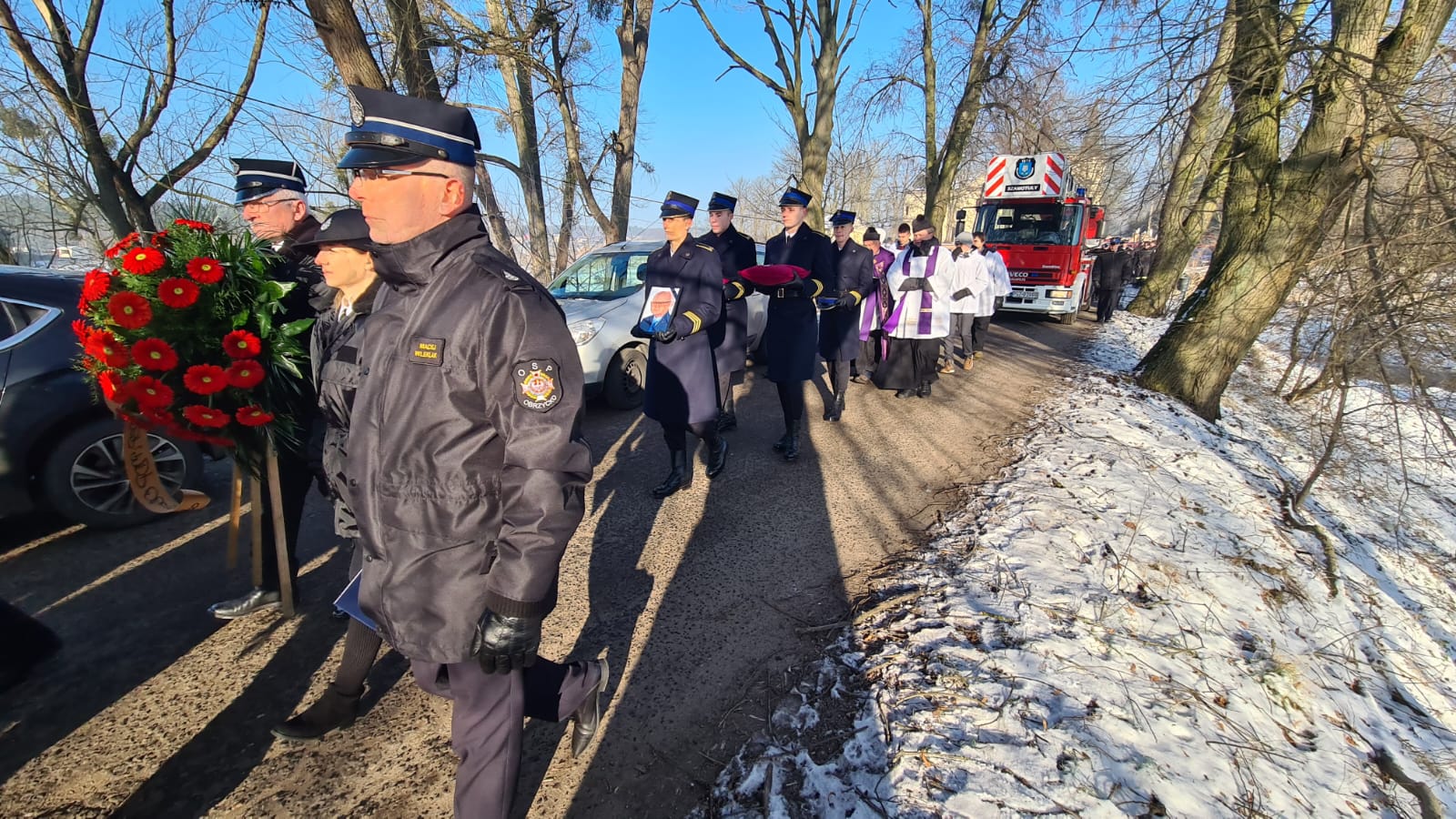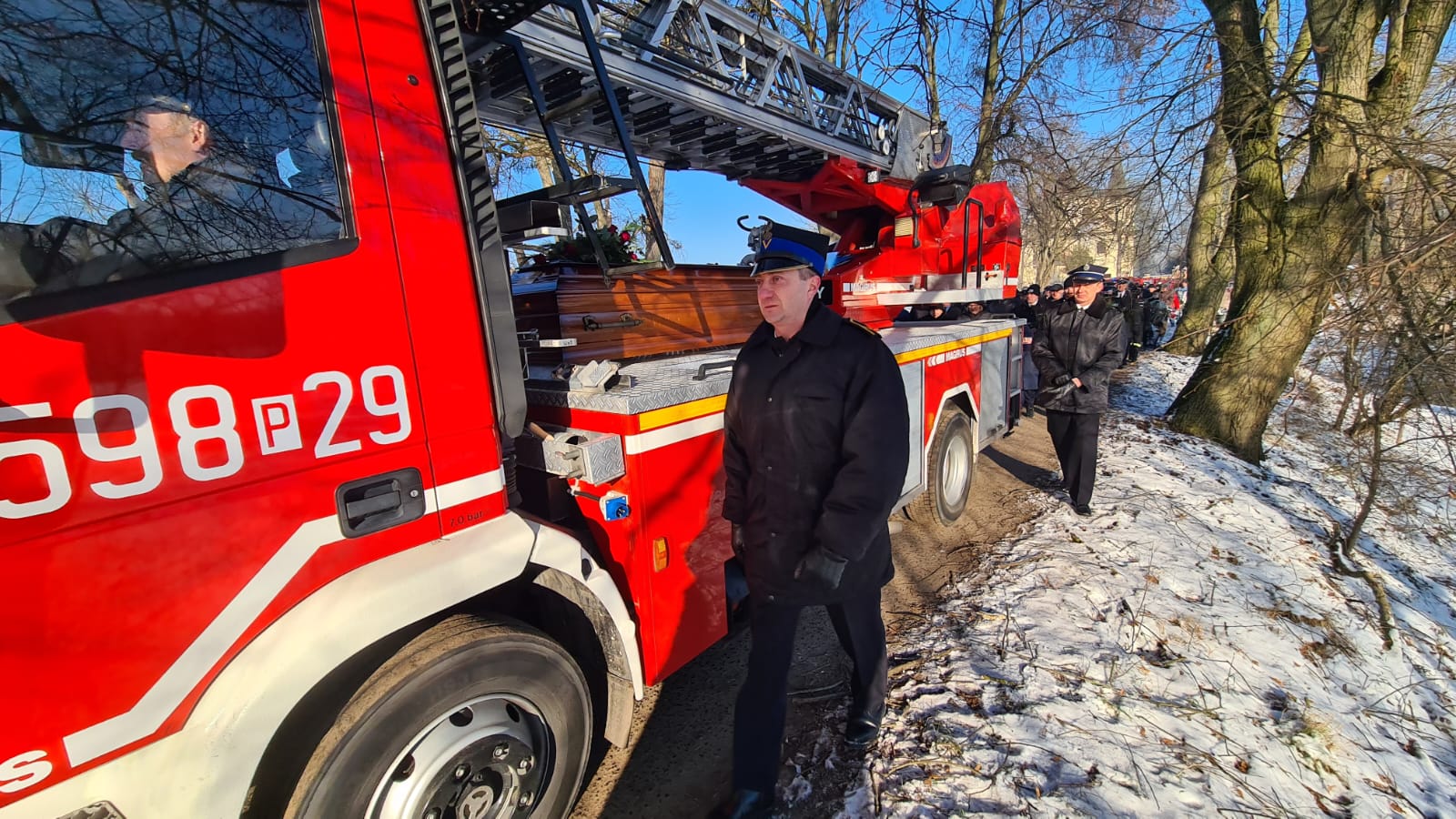 Zgodnie ze strażacką tradycją i ceremoniałem, trumna z ciałem zmarłego pokonała ostatnią drogę na samochodzie specjalnym z drabiną mechaniczną. Następnie trumnę na miejsce wiecznego spoczynku nieśli druhowie OSP i funkcjonariusze PSP.