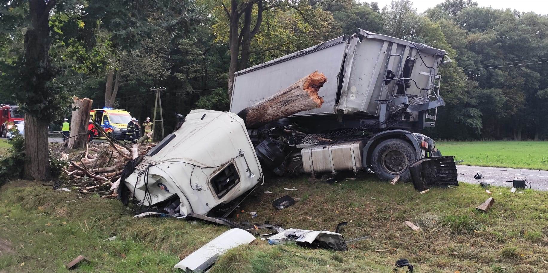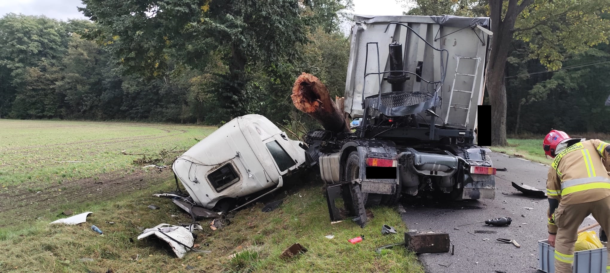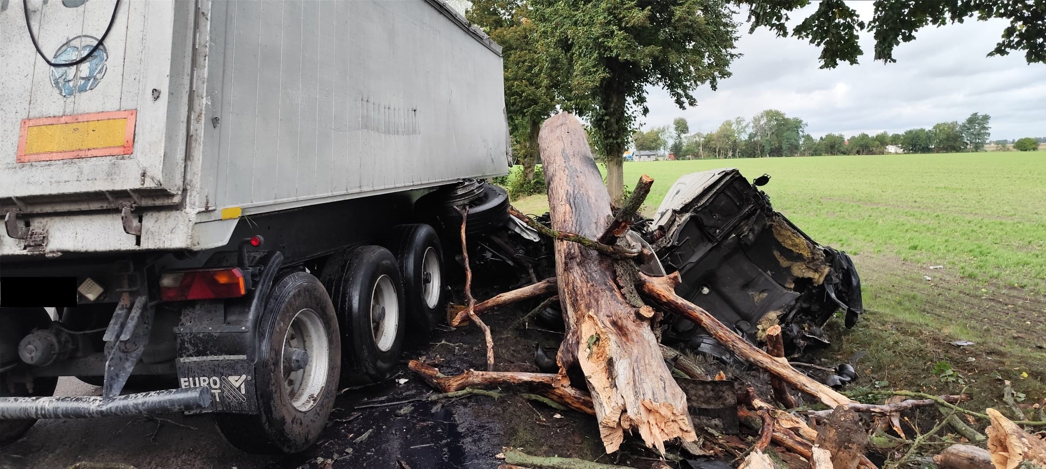 Samochód ciężarowy uderzył w drzewo, które się zapaliło