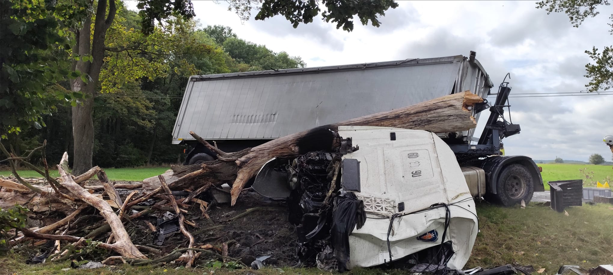 Po dojeździe na miejsce zdarzenia strażacy zastali samochód ciężarowy, który uderzył w suche drzewo.