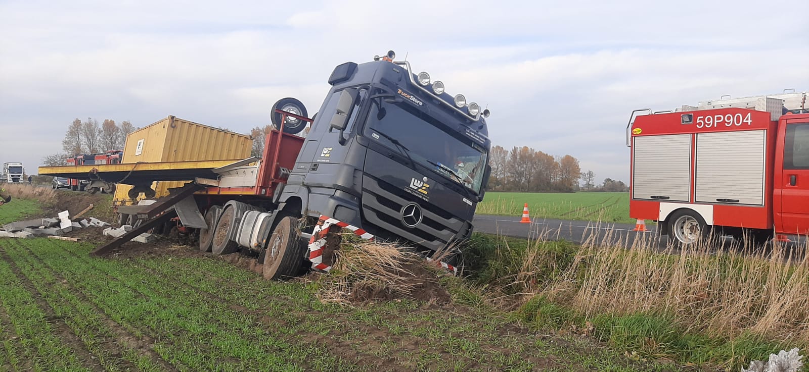 Po dojeździe na miejsce zdarzenia strażacy zastali samochód ciężarowy z przyczepą, który znajdował się w przydrożnym rowie. Kierujący opuścił pojazd przed przybyciem SP i znajdował się w pobliżu.