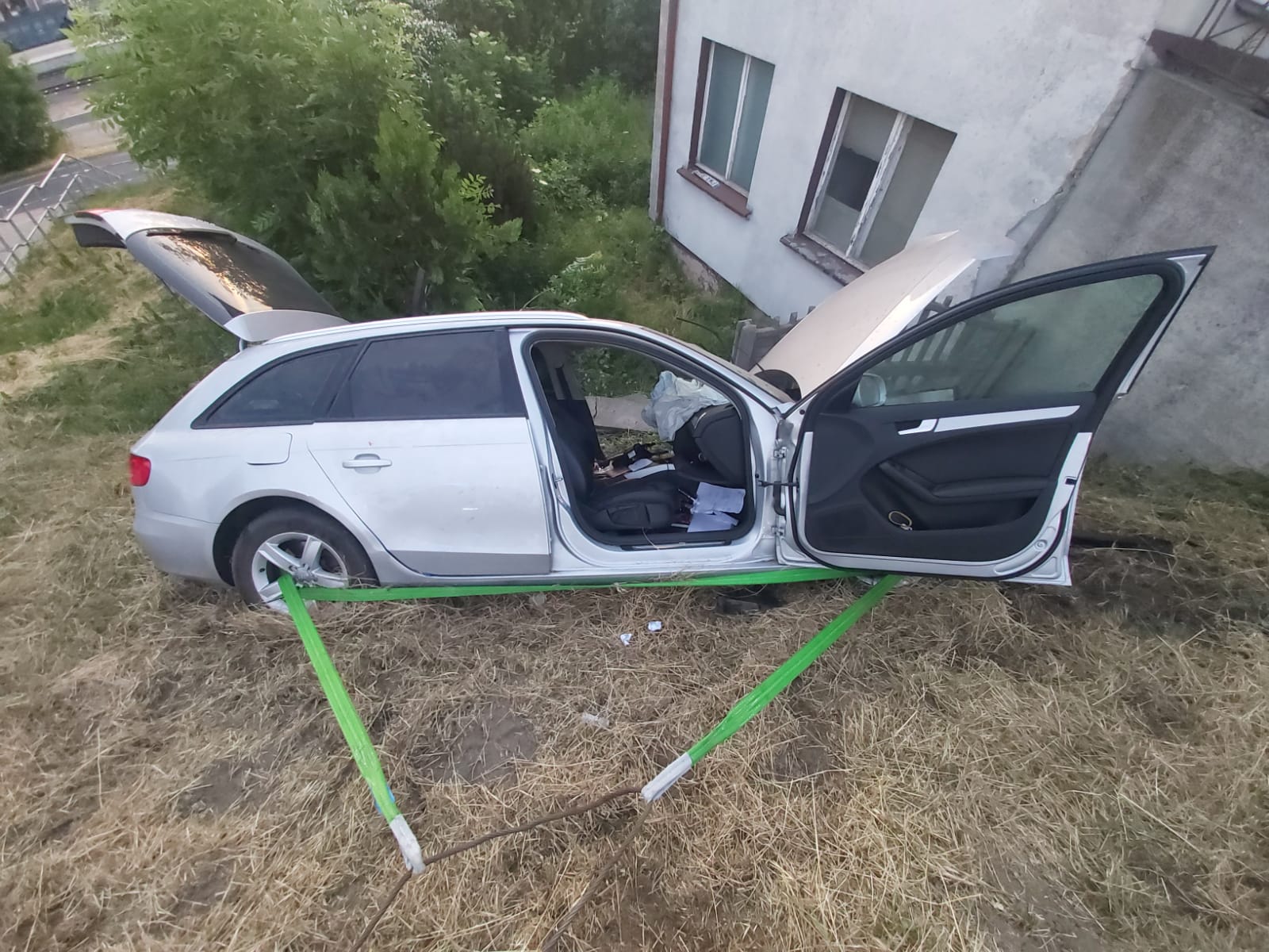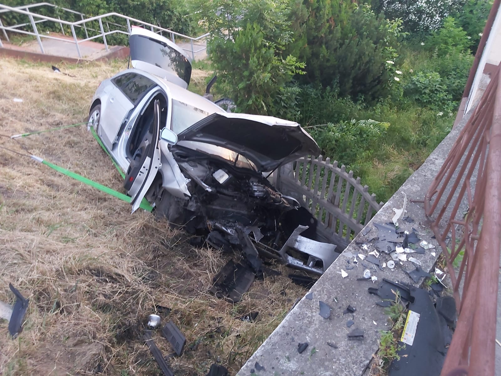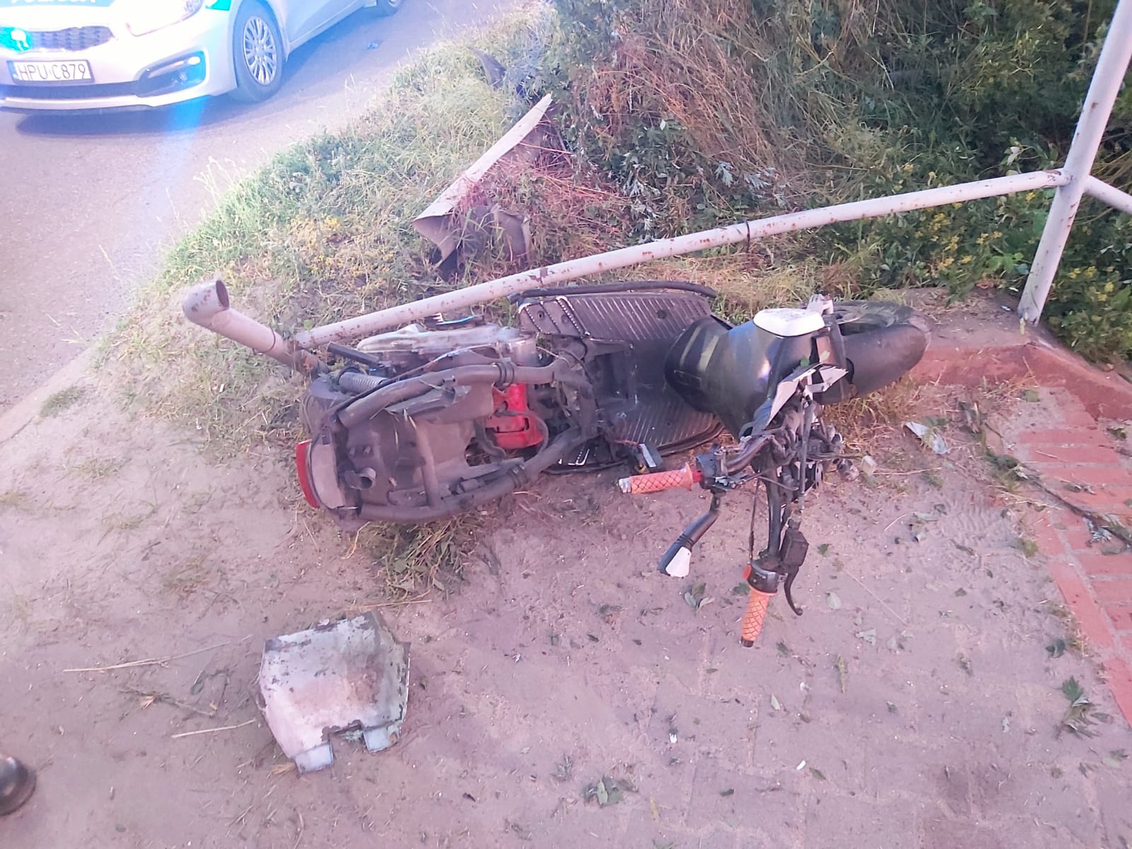 Po dojeździe na miejsce zdarzenia strażacy zastali samochód osobowy, który zderzył się z motorowerem. Kierujący samochodem znajdował się uwięziony wewnątrz pojazdu pod opieką ratowników ZRM, natomiast kierujący motorowerem oddalił się z miejsca zdarzenia. Samochód znajdował się poza drogą, natomiast motorower przy barierkach od schodów.