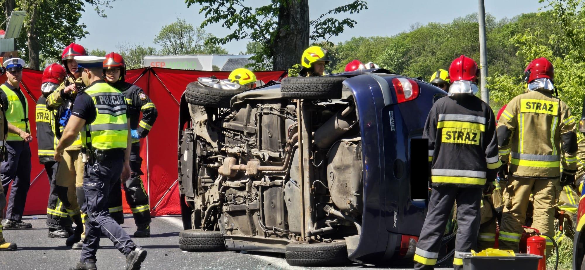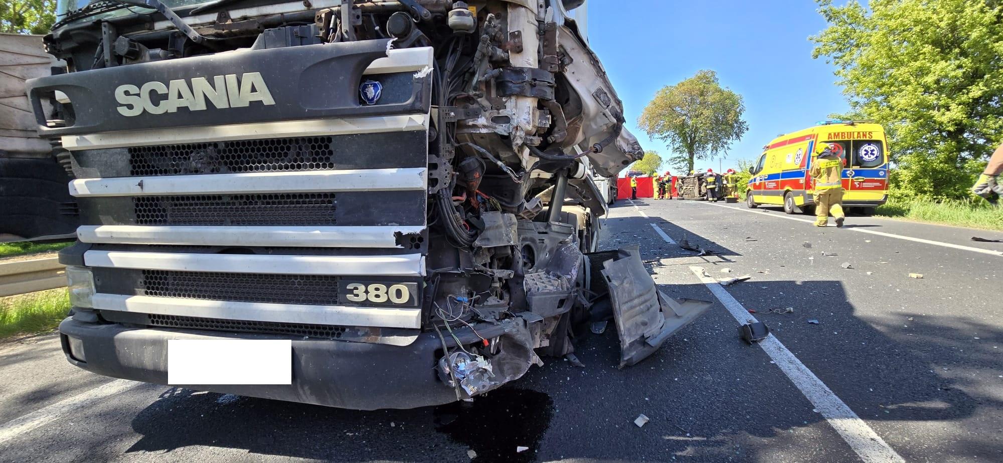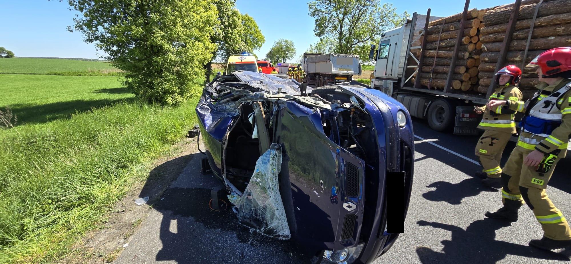 Po dojeździe na miejsce zdarzenia strażacy zastali samochód osobowy marki Renault leżący na prawym boku, który zderzył się z pojazdem ciężarowym.