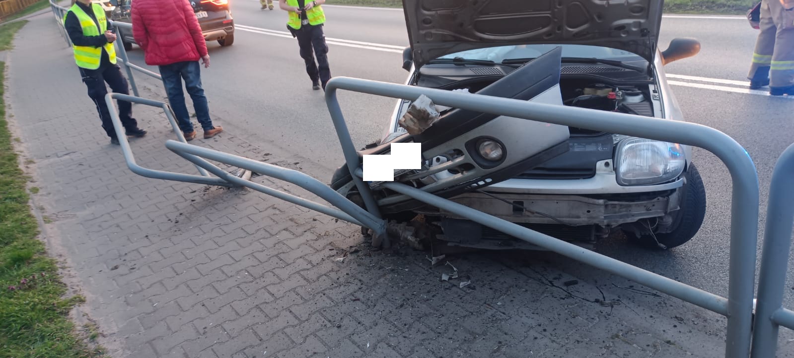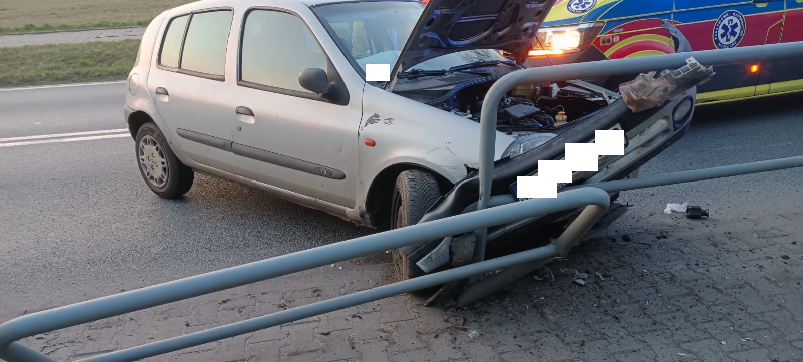 Po dojeździe na miejsce zdarzenia strażacy zastali samochód osobowy marki Renault Clio, który uderzył w barierki. Kierujący opuścił pojazd przed przybyciem SP i znajdował się w pobliżu.