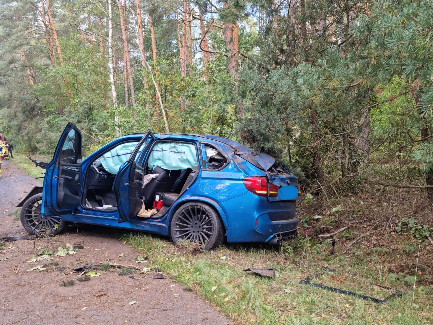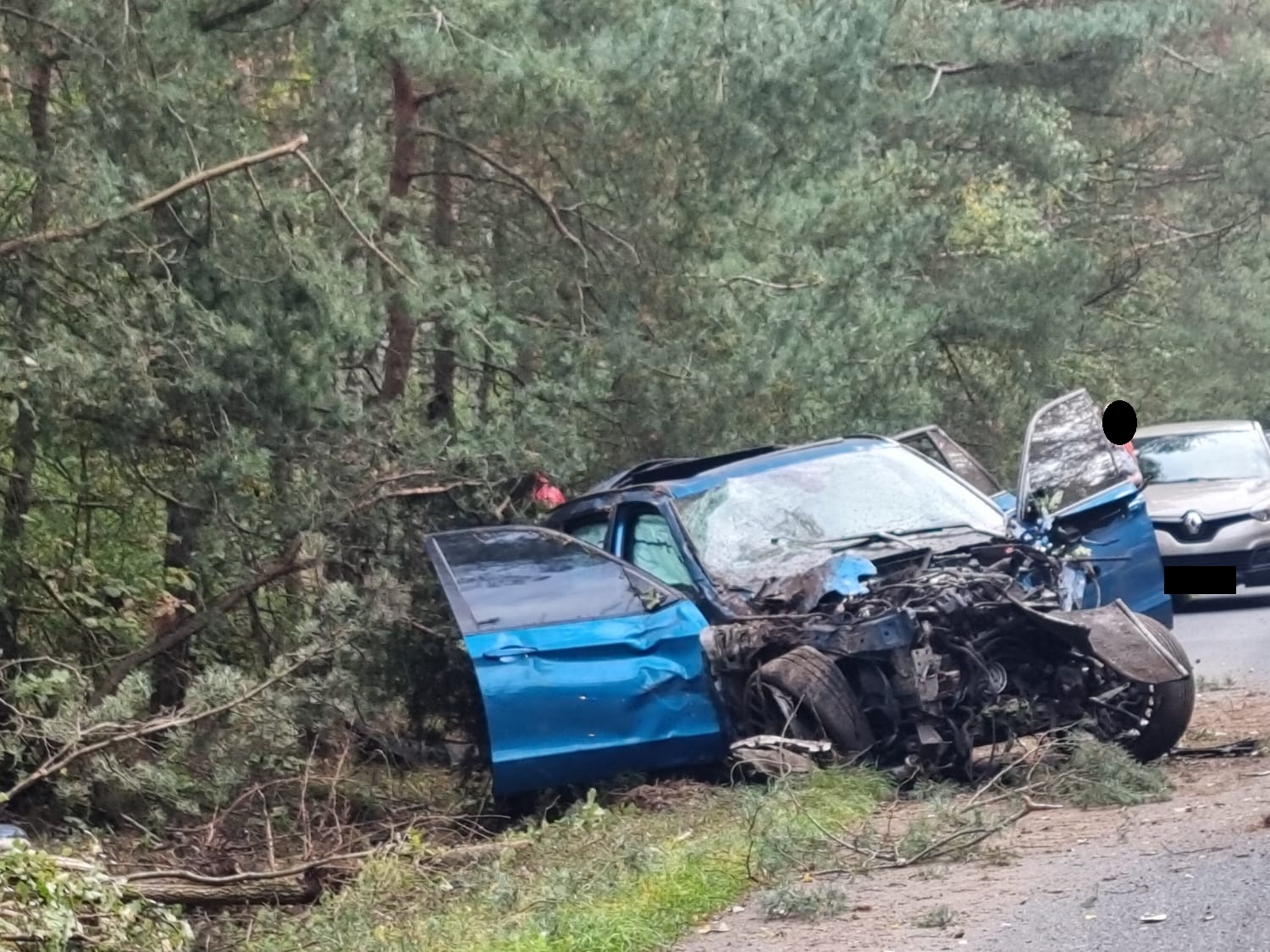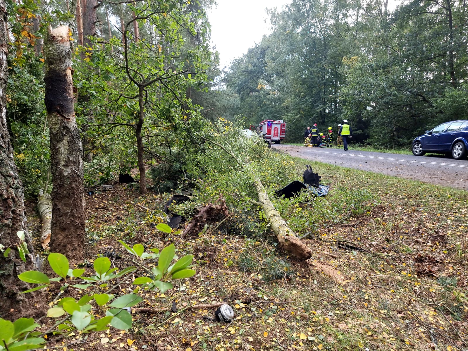 Po dojeździe na miejsce zdarzenia strażacy zastali uszkodzony samochód osobowy, który uderzył w kilka drzew i znajdował się na poboczu drogi. Kierujący i pasażer opuścili pojazd przed przybyciem SP i znajdowali się w pobliżu, dwie osoby zostały poszkodowane.