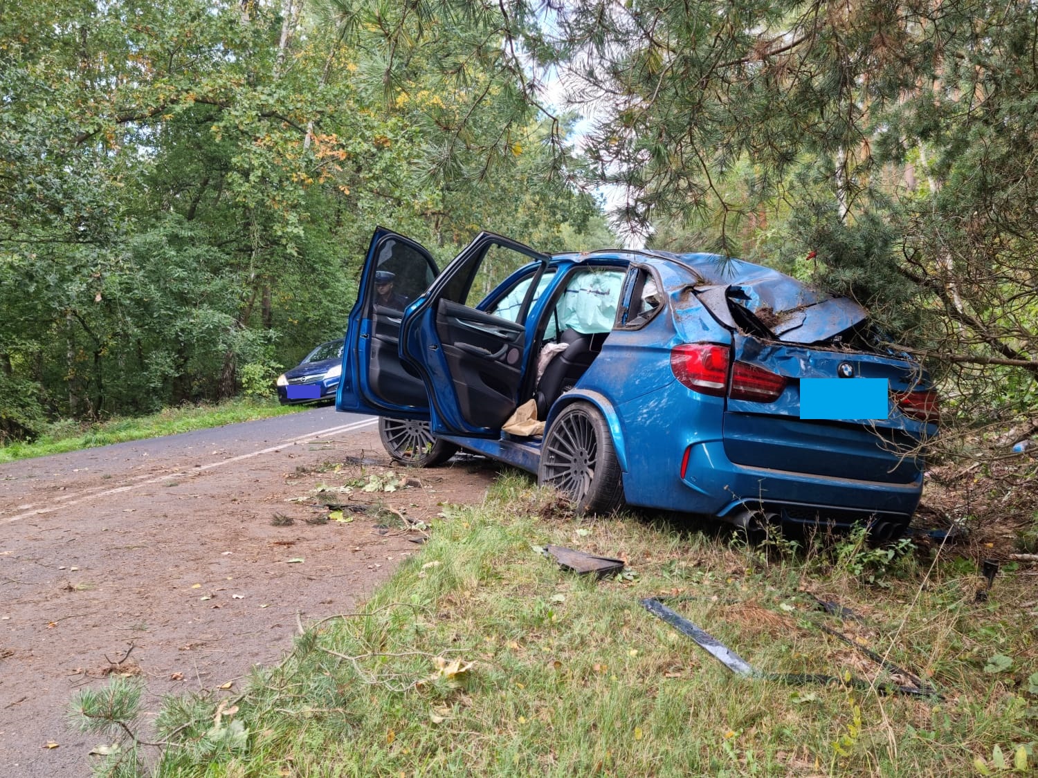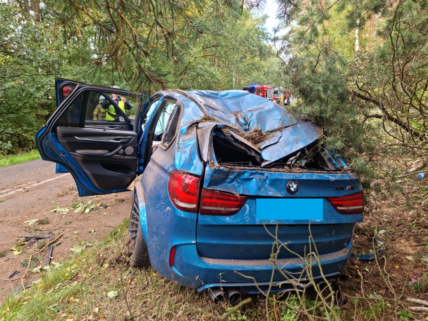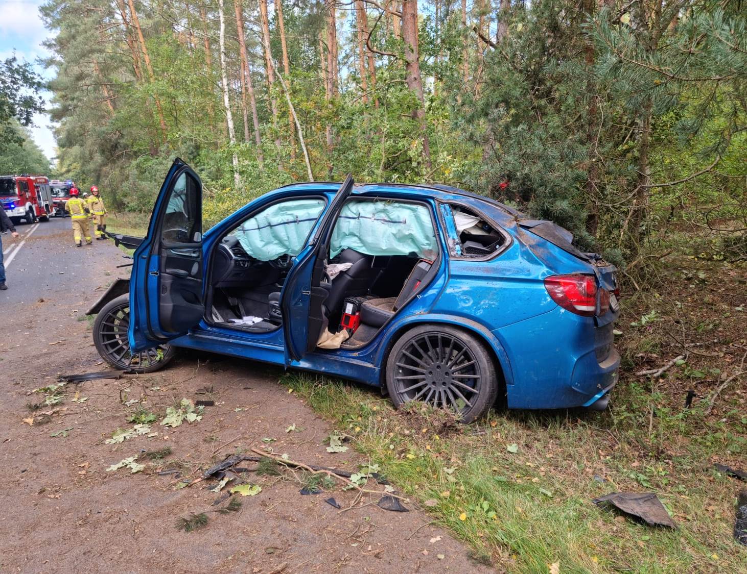 Po dojeździe na miejsce zdarzenia strażacy zastali uszkodzony samochód osobowy, który uderzył w kilka drzew i znajdował się na poboczu drogi. Kierujący i pasażer opuścili pojazd przed przybyciem SP i znajdowali się w pobliżu, dwie osoby zostały poszkodowane.