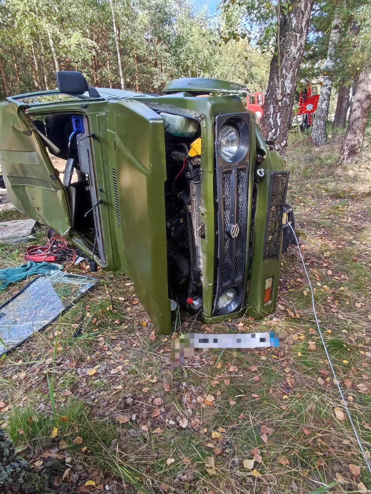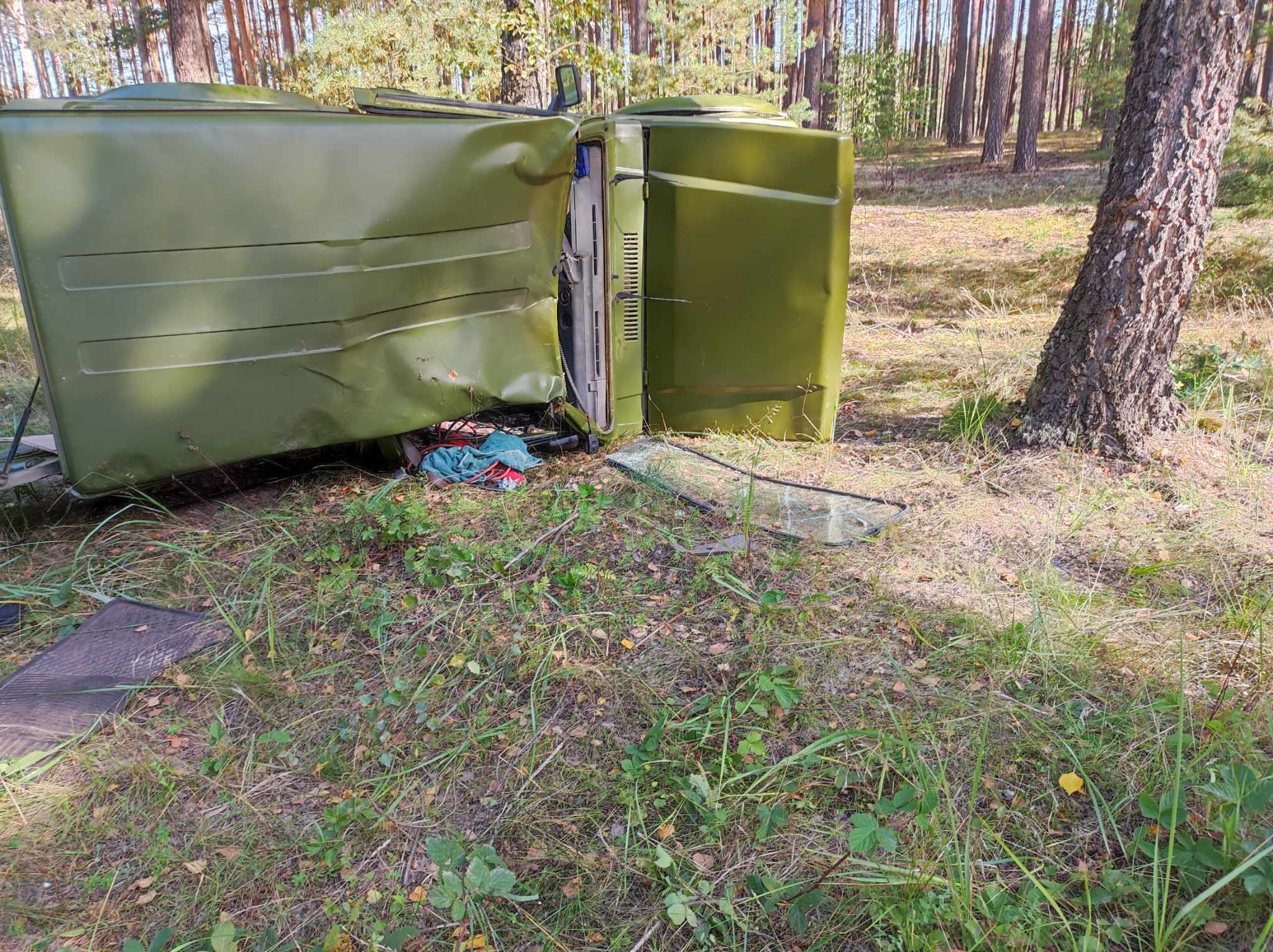 Po dojeździe na miejsce zdarzenia strażacy zastali leżący na boku samochód, który uderzył w drzewo. Kierujący i pasażer opuścili pojazd przed przybyciem SP i znajdowali się w pobliżu.