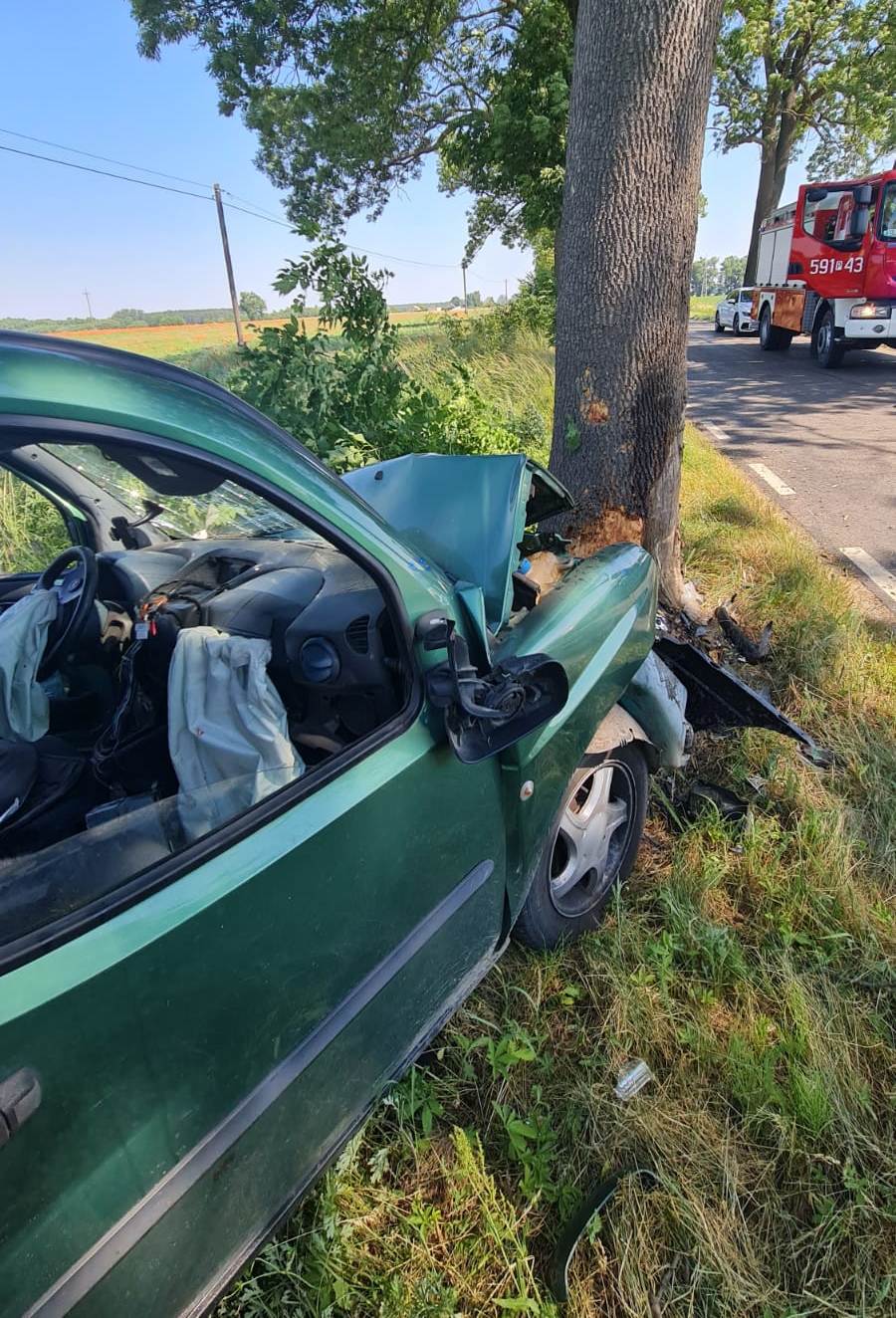 W sobotę, 19 czerwca o godzinie 10.48 do dyżurnego Stanowiska Kierowania Państwowej Straży Pożarnej w Szamotułach wpłynęło zgłoszenie z Centrum Powiadamiania Ratunkowego o uderzeniu samochodu w drzewo oraz dwóch osobach poszkodowanych w miejscowości Myszkowo gm. Szamotuły.