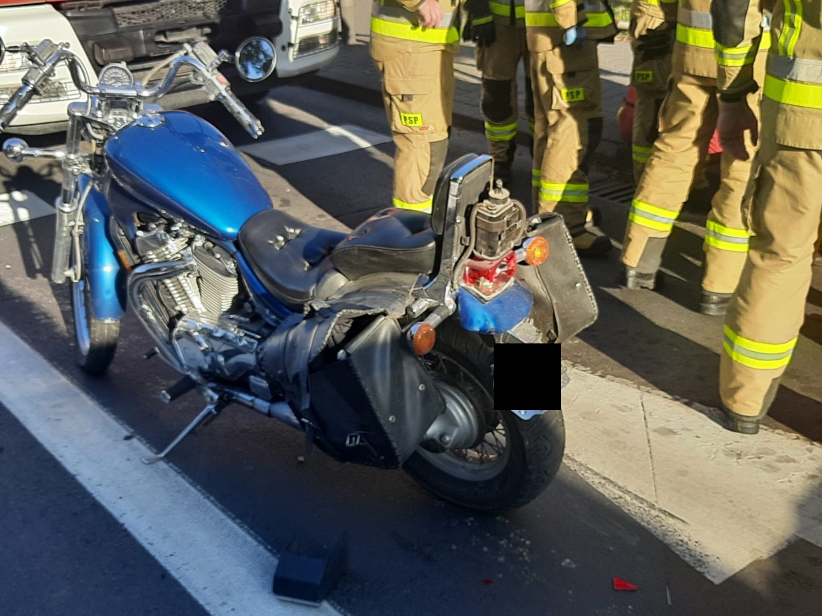 Po dojeździe na miejsce zdarzenia strażacy zastali samochód osobowy, który uderzył w tył motocykla. Kierujący i pasażerka motocykla zostali poszkodowani.