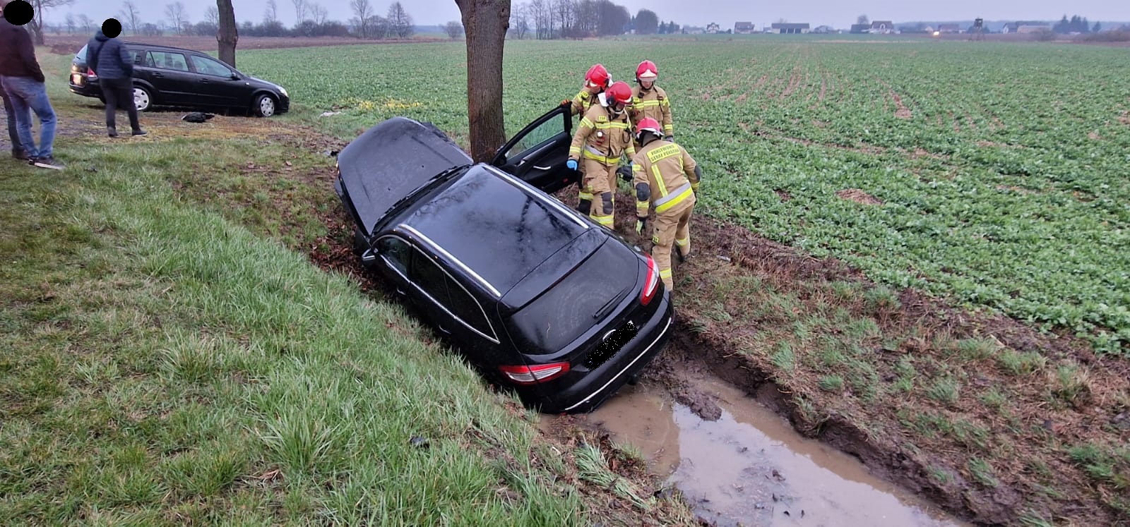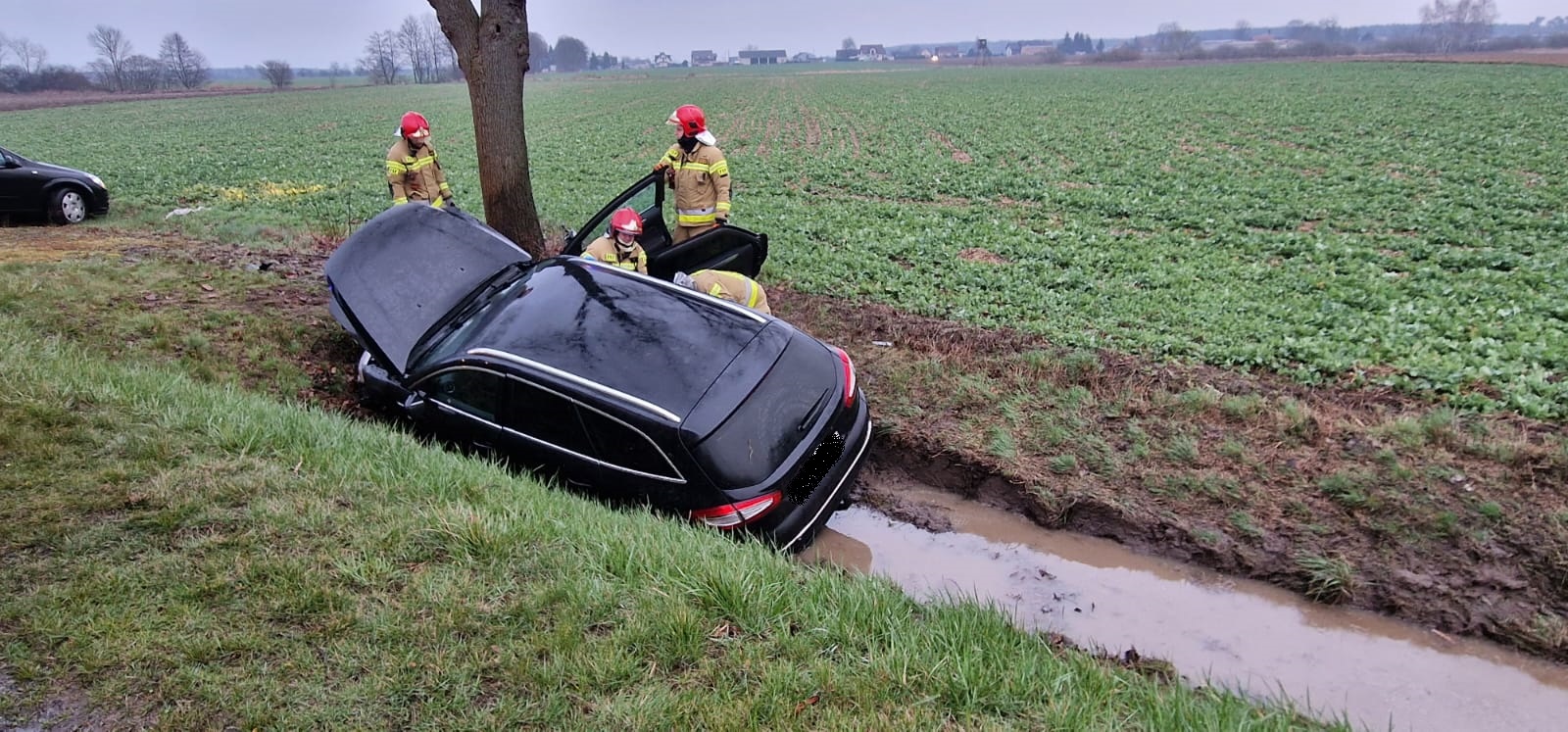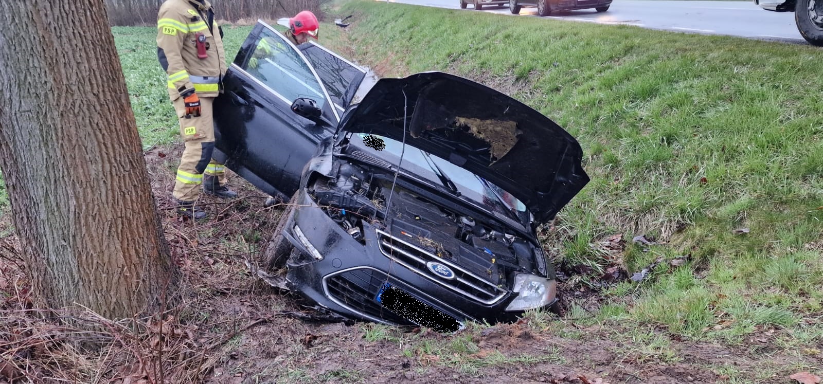 Po dojeździe na miejsce zdarzenia strażacy zastali samochód osobowy, który znajdował się w przydrożnym rowie. Osoby podróżujące (kobieta i dwójka dzieci) opuściły pojazd przed przybyciem SP i znajdowały się w pobliżu.