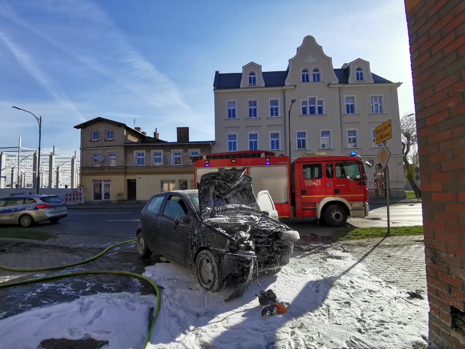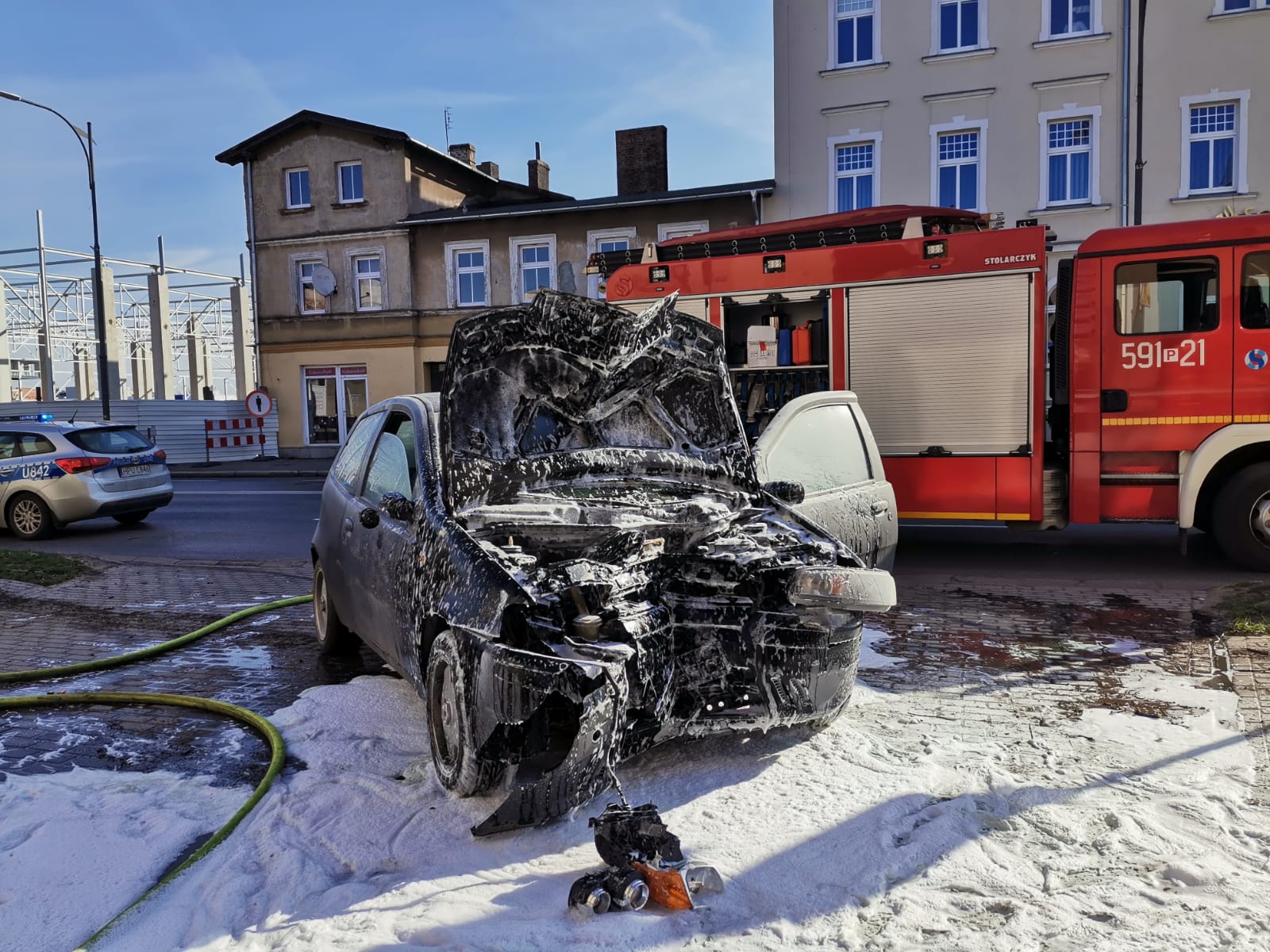 Po dojeździe na miejsce zdarzenia strażacy zastali samochód osobowy, który uderzył w budynek sklepu ogrodniczego oraz pożar komory silnika. Kierujący opuścił pojazd przed przybyciem SP i znajdował się w pobliżu pod opieką świadków zdarzenia.