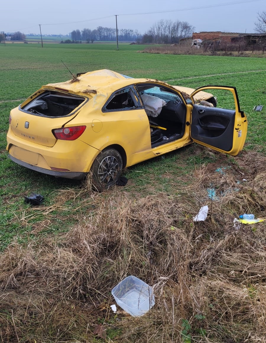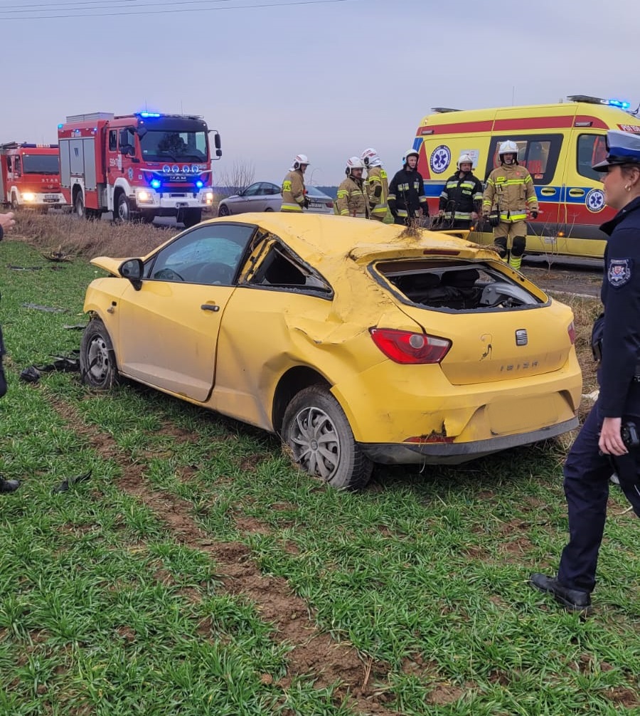 Po dojeździe na miejsce zdarzenia strażacy zastali samochód osobowy marki Seat, który po dachowaniu znajdował się na pobliskim polu. Kierująca opuściła pojazd przed przybyciem SP i znajdowała się w pobliżu pod opieką świadków zdarzenia.