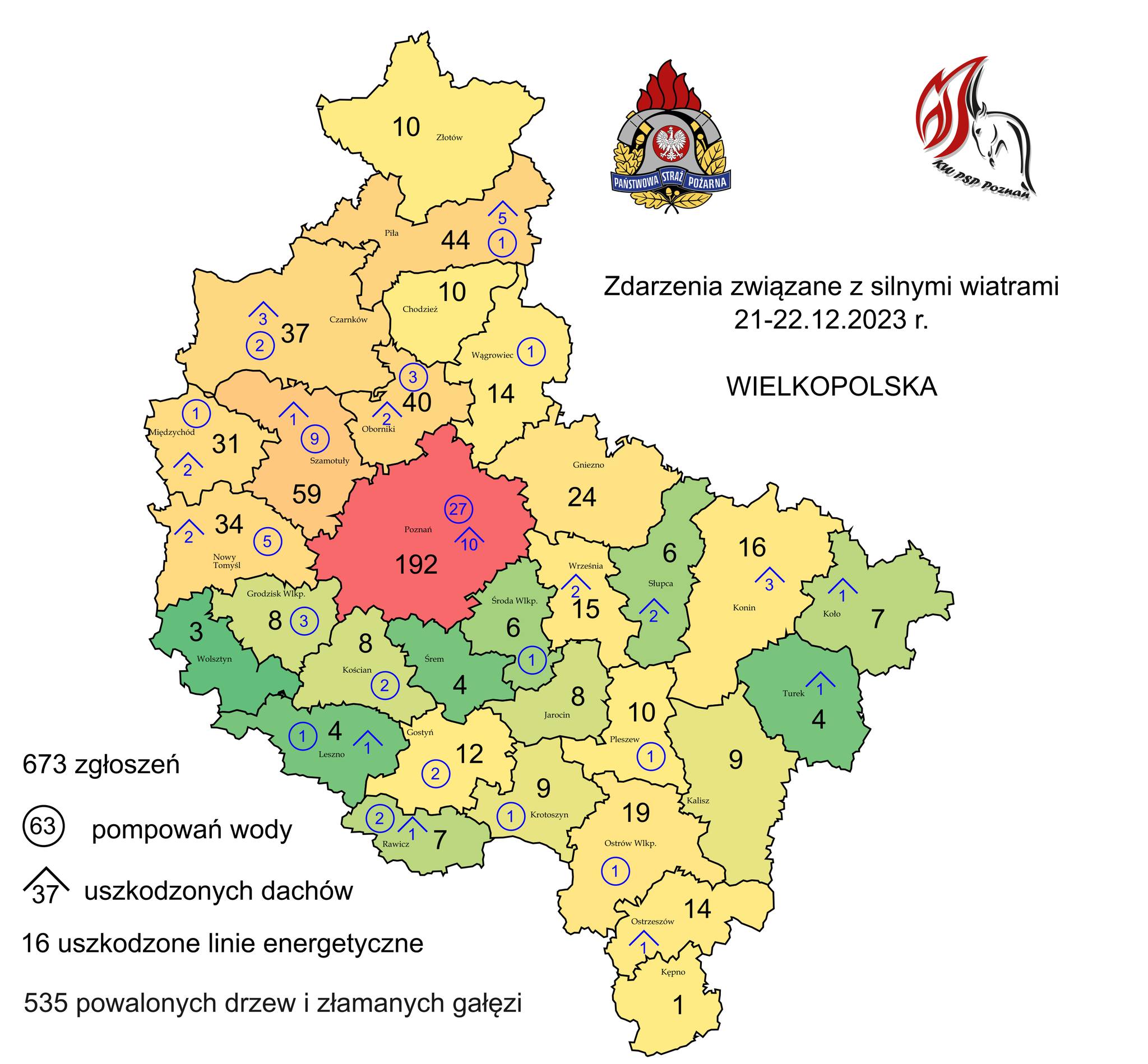 Od godziny 16.16 dnia 21 grudnia do godziny 22.00 dnia 22 grudnia 2023 roku Stanowisko Kierowania Komendanta Powiatowego PSP w Szamotułach otrzymało ponad 60 zgłoszeń jakie występowały na terenie powiatu szamotulskiego. Aby było to możliwe, konieczne było podniesienie stanów osobowych w Komendzie Powiatowej PSP w Szamotułach.