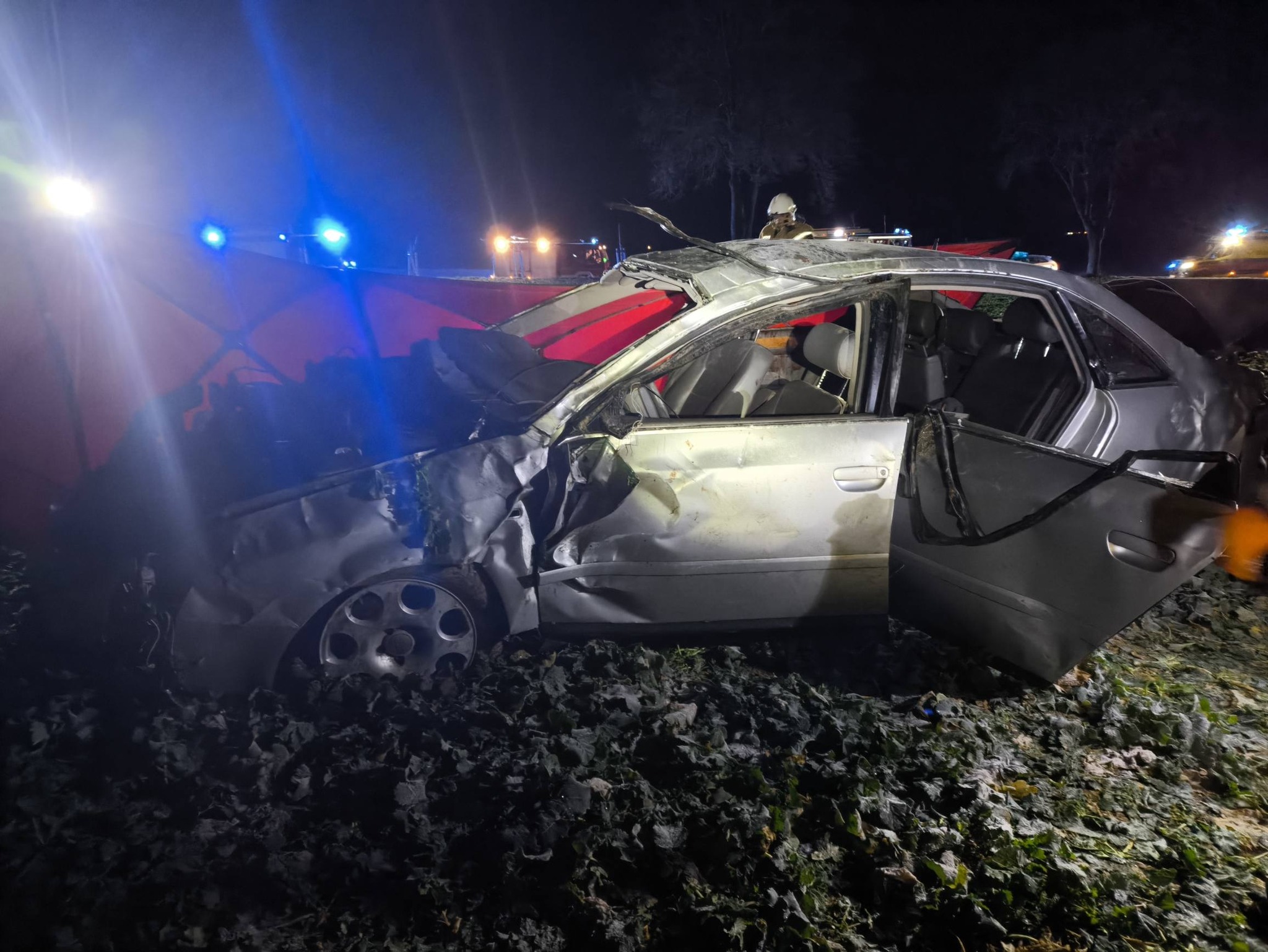 Po dojeździe na miejscu zdarzenia strażacy zastali samochód osobowy marki Audi, który po dachowaniu znajdował się na pobliskim polu. Kierujący i pasażerowie znajdowali się w pobliżu pojazdu - jedna osoba brak funkcji życiowych.