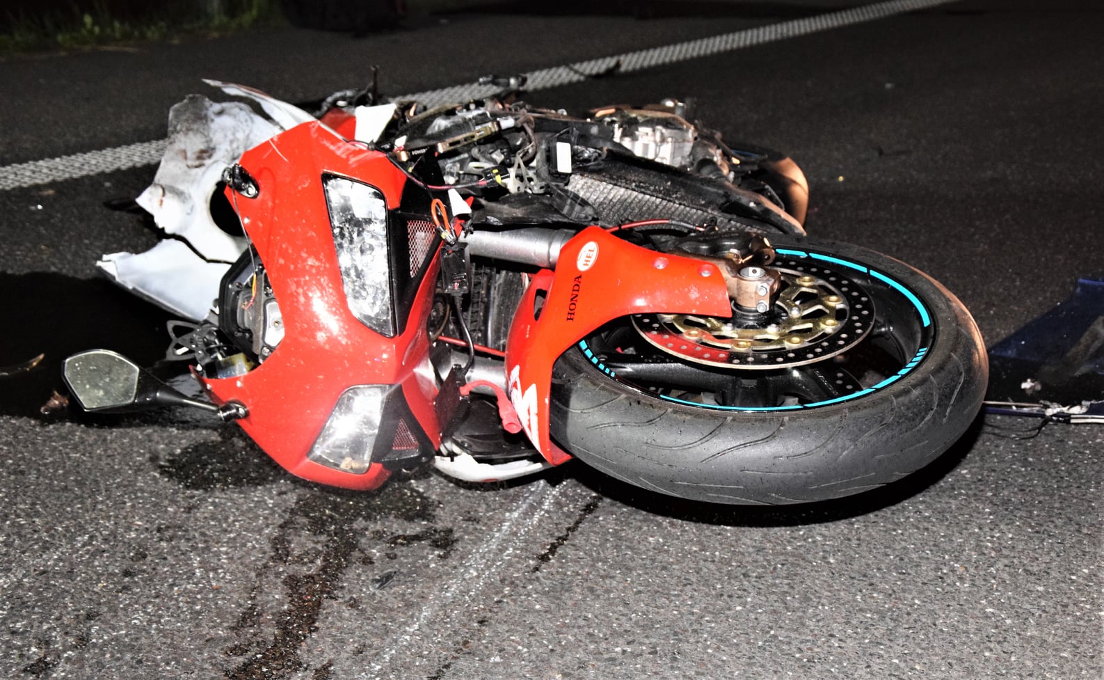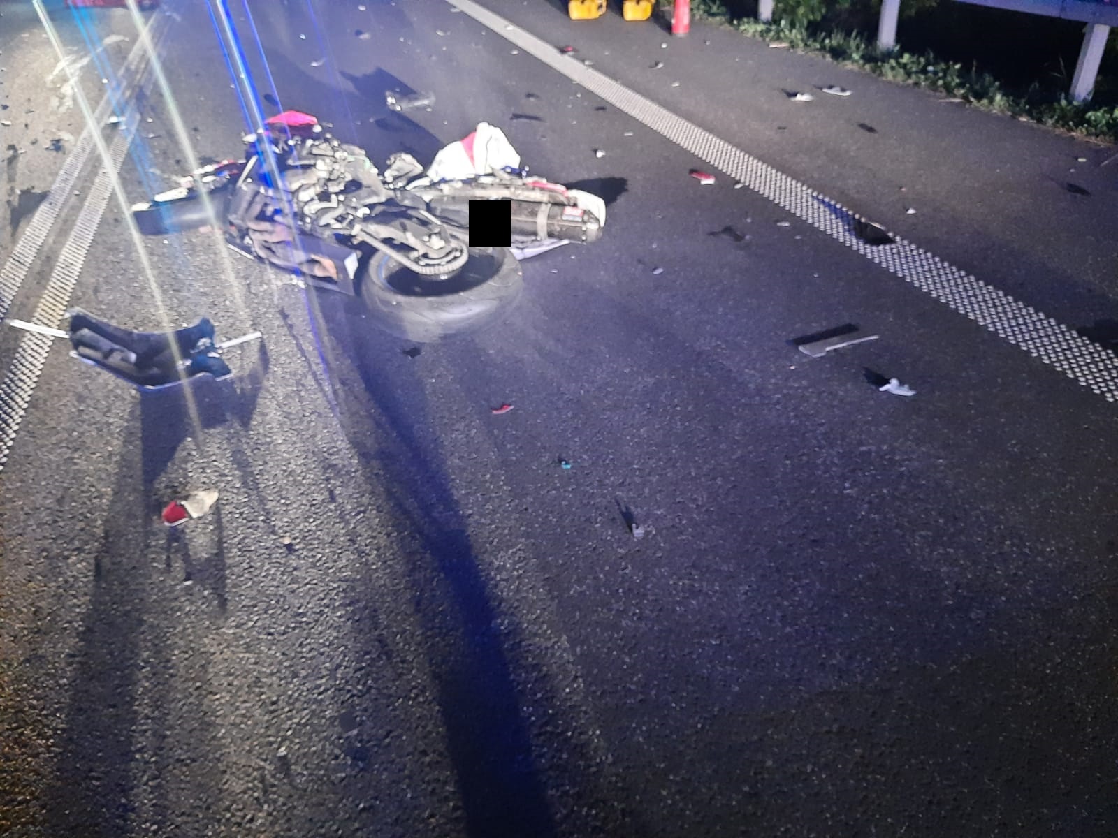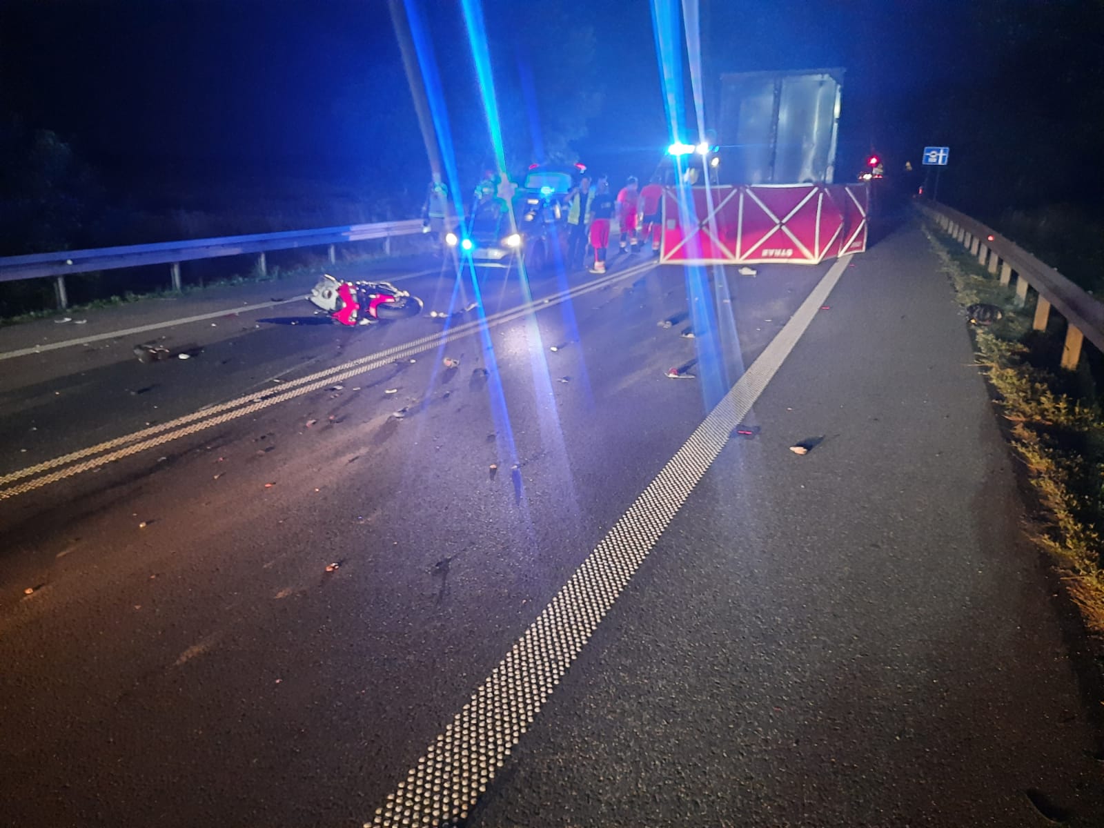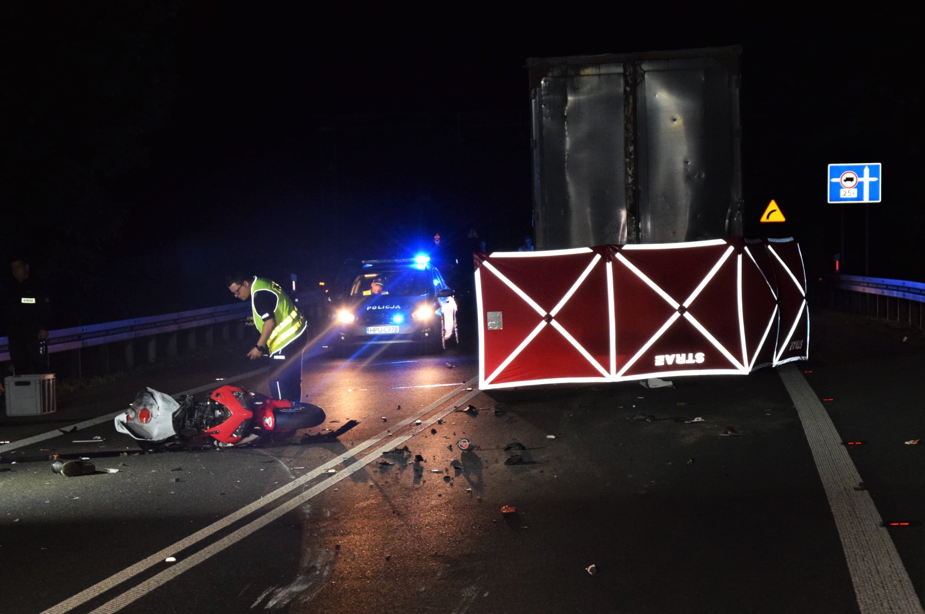 Po dojeździe na miejsce zdarzenia strażacy zastali motocykl, który po uderzeniu w tył naczepy samochodu ciężarowego znajdował się na środku drogi.