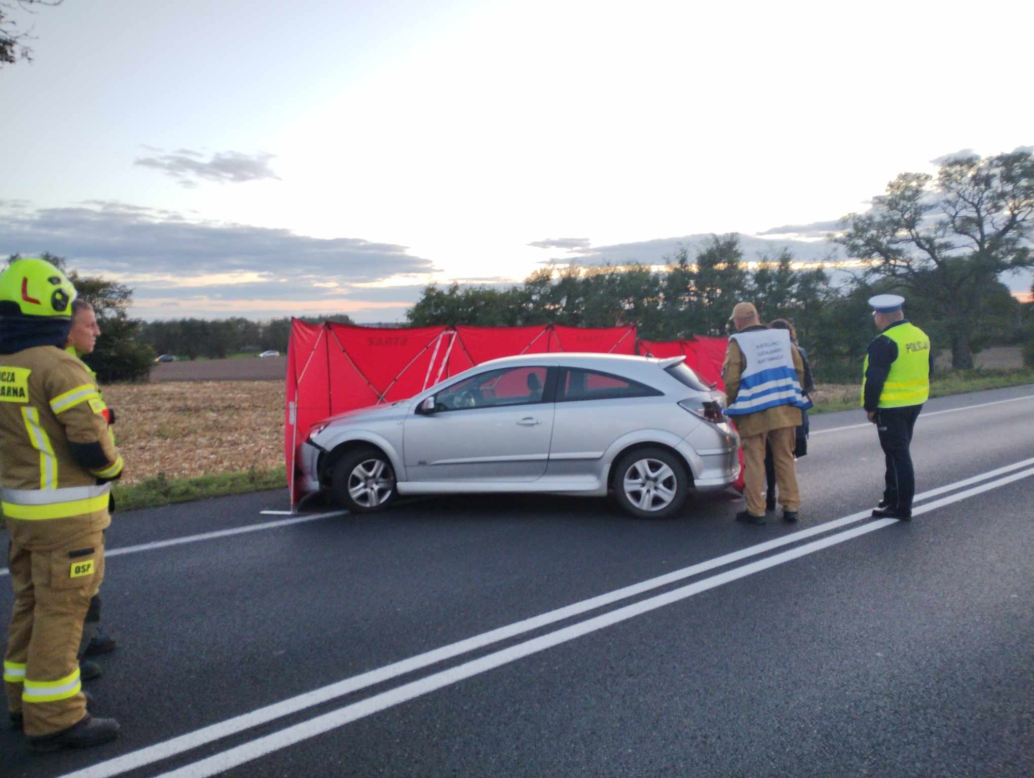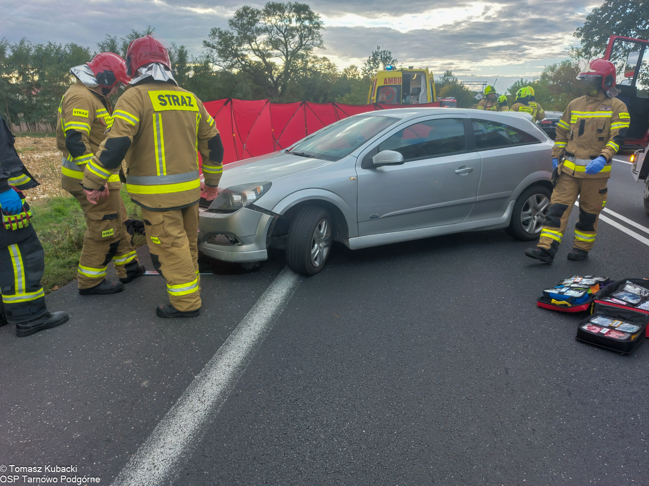 Po dojeździe na miejsce zdarzenia strażacy zastali motocykl marki Yamaha, który uderzył w tył samochodu osobowego marki Volkswagen. W wyniku zdarzenia jedna osoba spadła z motocykla i została potrącona przez nadjeżdżający pojazd marki Opel. Na miejscy były dwa zespoły ratownictwa medycznego, ratownicy udzielali kwalifikowanej pierwszej pomocy osobom poszkodowany.