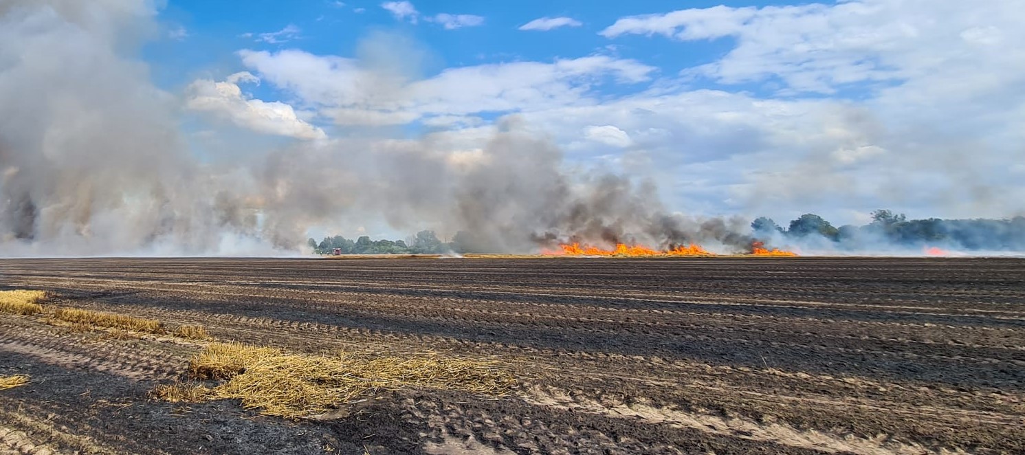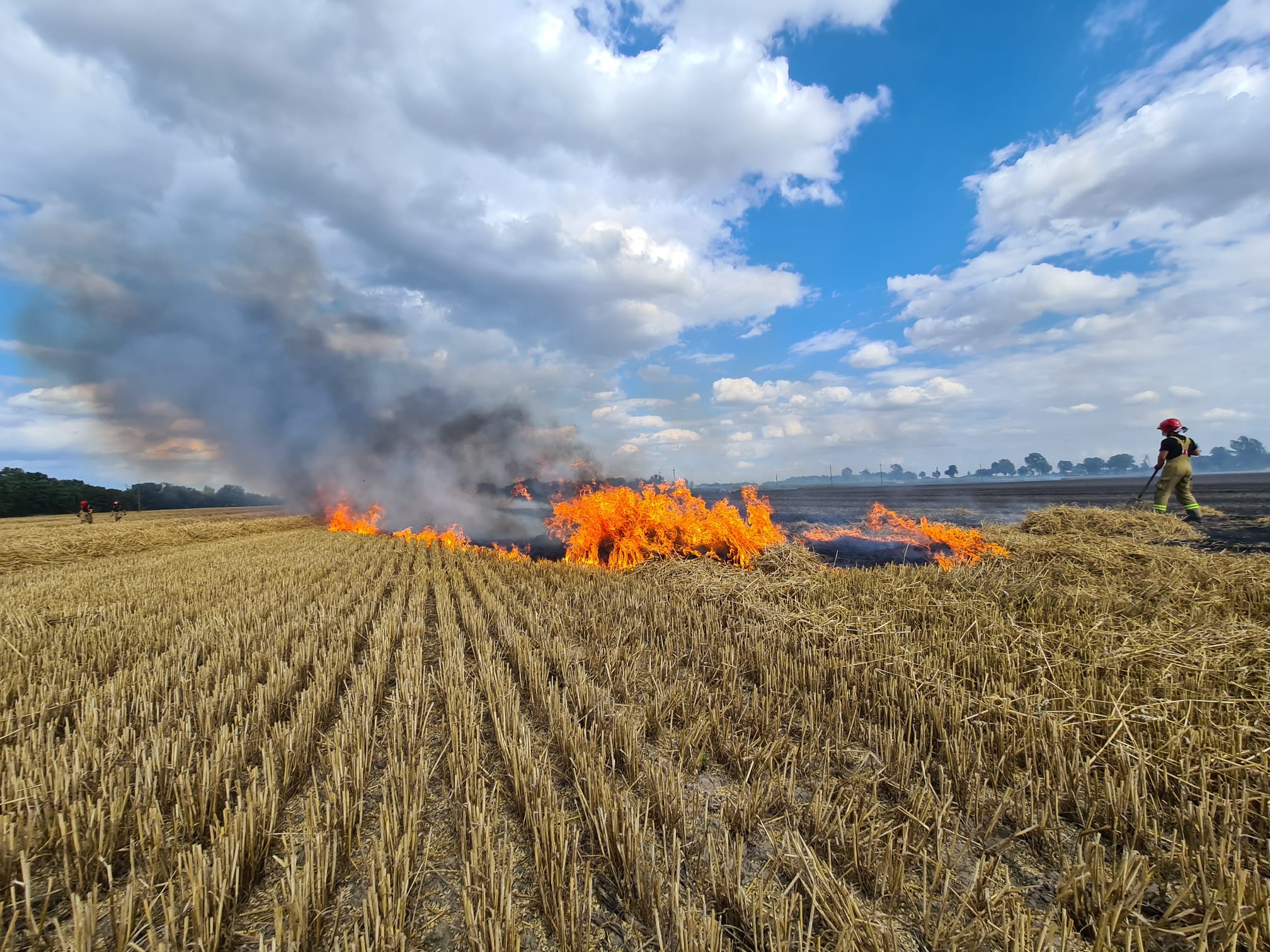 Po dojeździe na miejsce zdarzenia strażacy zastali pożar ściernisk i balotów słomy.