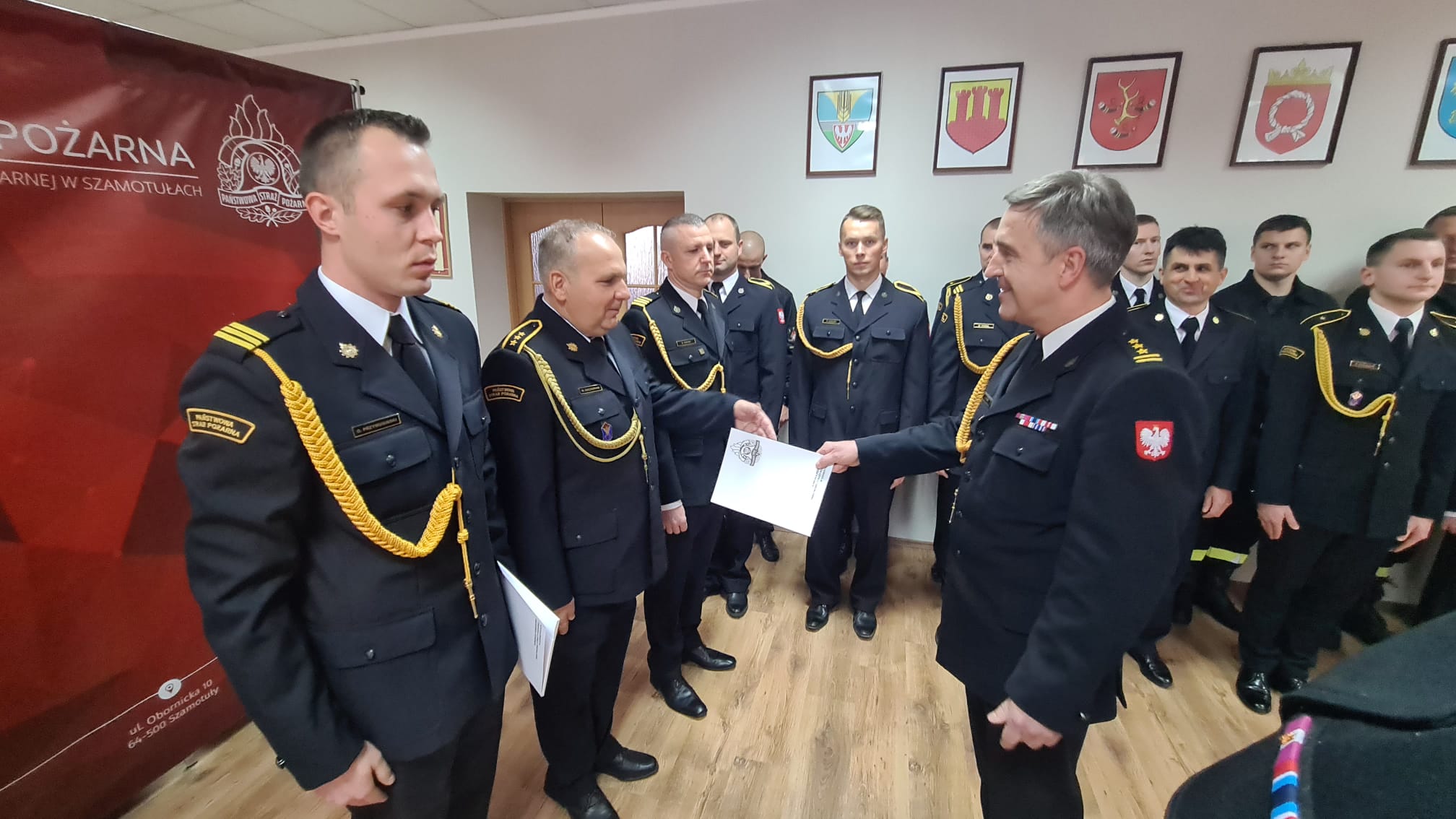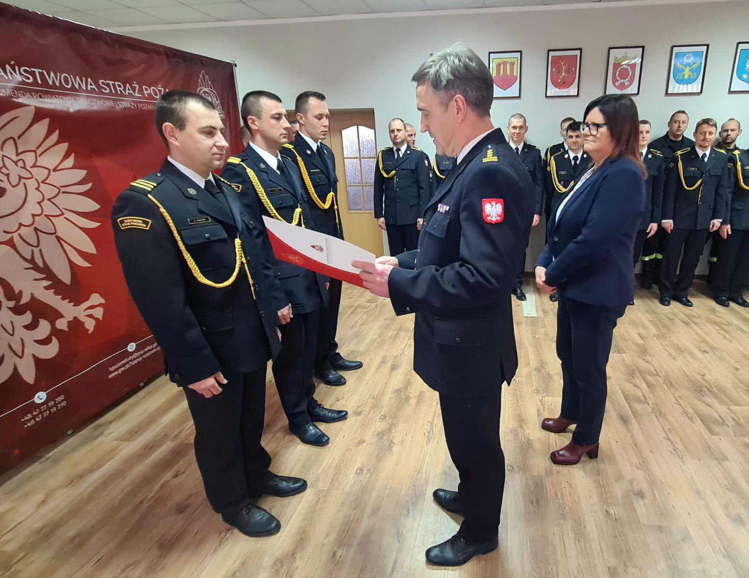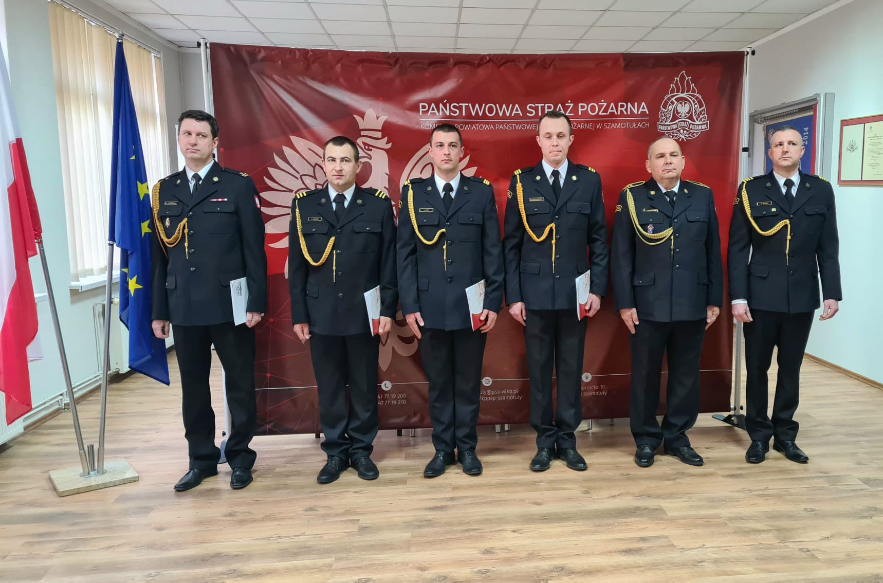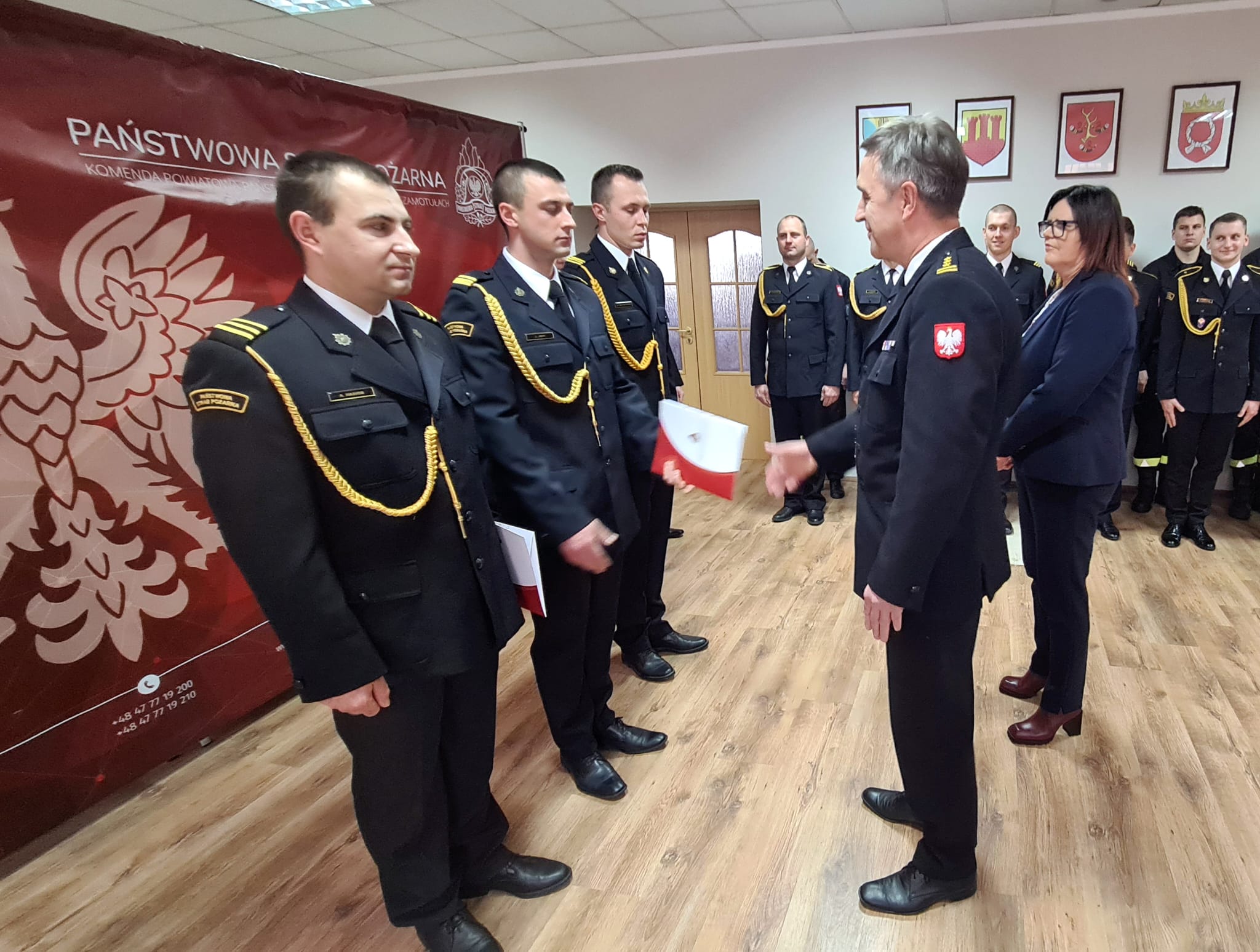 Wręczenia decyzji o awansach na wyższy stopnie służbowe oraz decyzji nagrodowych dokonali: Starosta Powiatu Szamotulskiego Pani Beta Hanyżak, Komendant Powiatowy Państwowej Straży Pożarnej w Szamotułach st. bryg. Ireneusz Pers oraz Zastępca Komendanta Powiatowego bryg. Arkadiusz Rakowski.