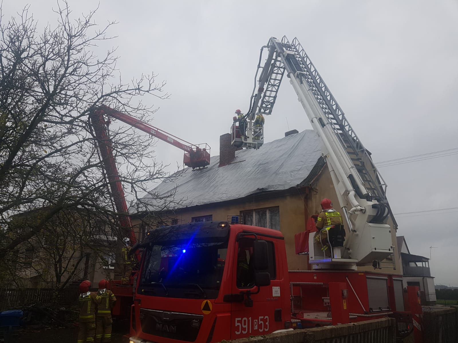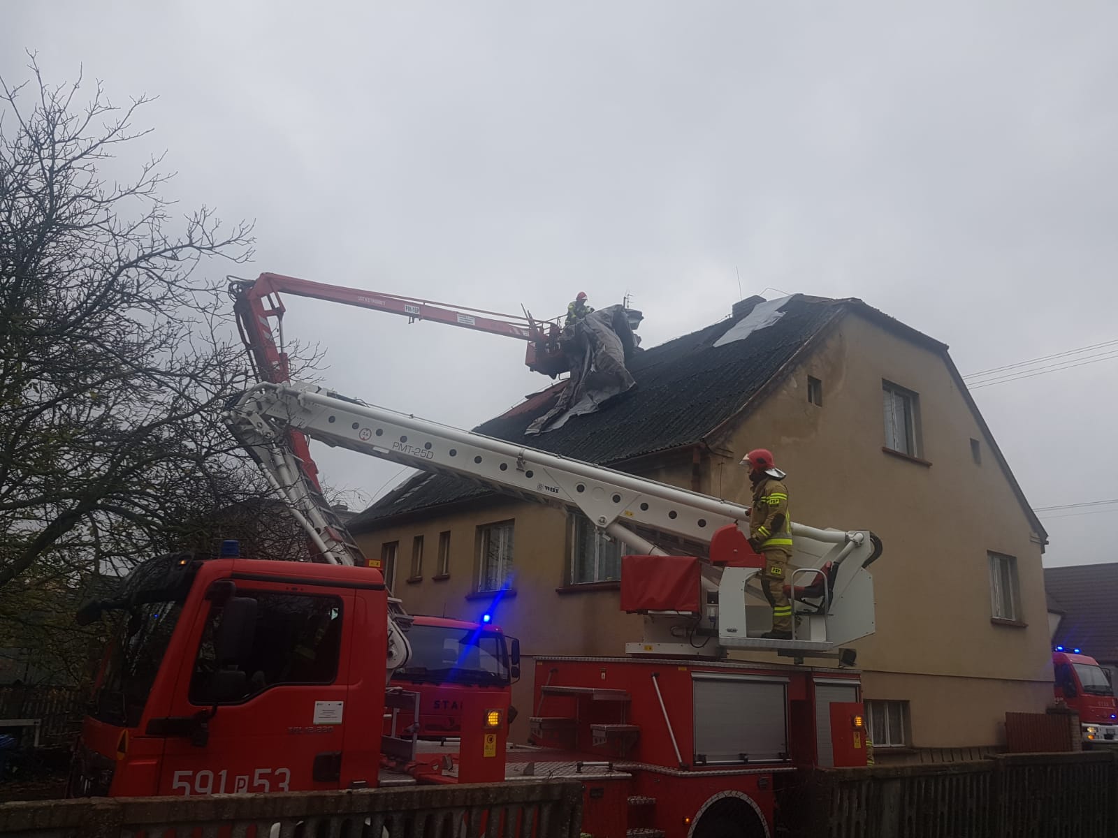 Działania SP polegały na zabezpieczeniu miejsca zdarzenia, zdemontowaniu uszkodzonych elementów pokrycia dachowego oraz zabezpieczeniu dachu za pomocą plandeki.