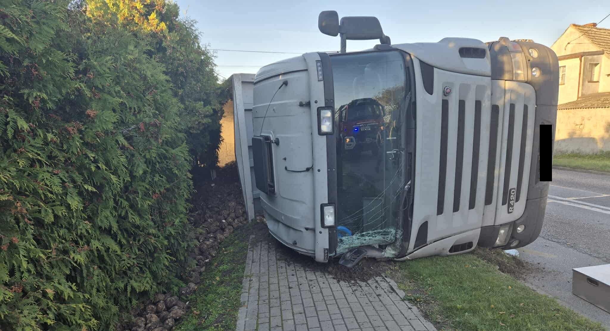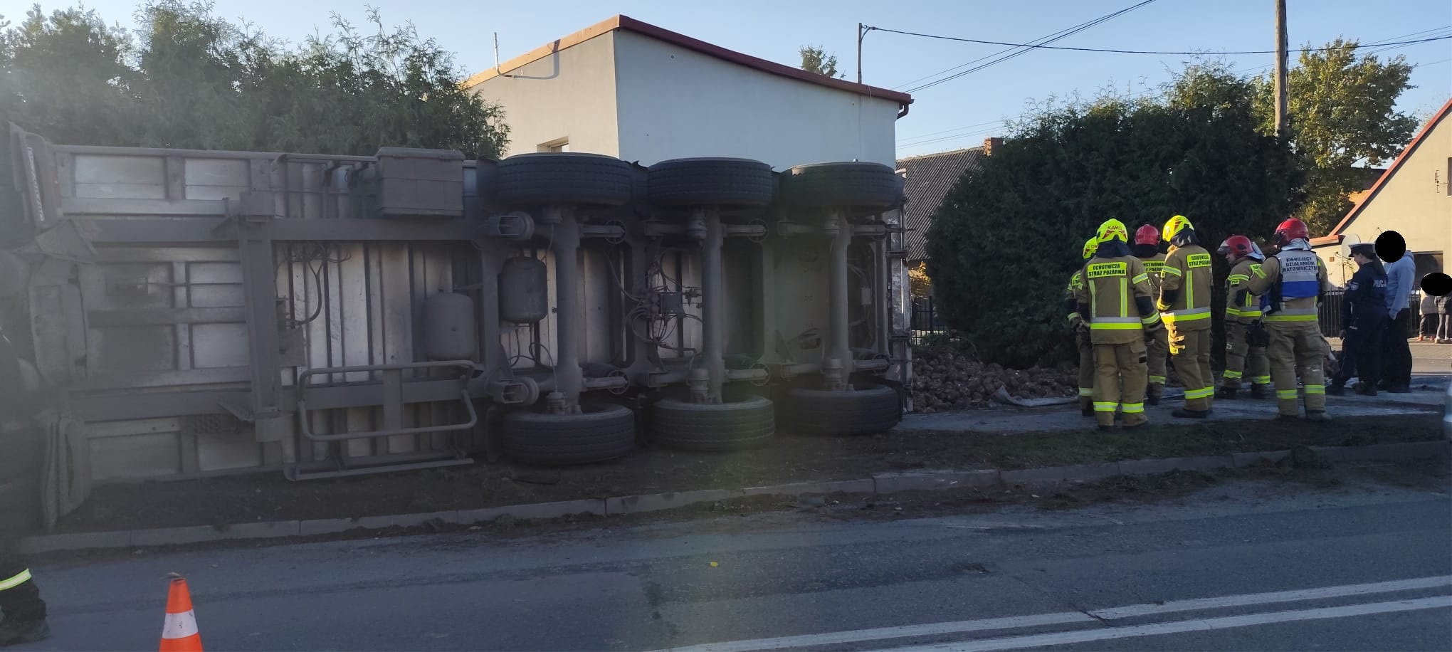 W poniedziałek, 20 października 2025 roku o godz. 15.54 do dyżurnego Stanowiska Kierowania Państwowej Straży Pożarnej w Szamotułach wpłynęło zgłoszenie z Centrum Powiadamiania Ratunkowego, które informowało o pojeździe ciężarowym z naczepą, który wioząc buraki przewrócił się na zakręcie i leży na prawym boku w miejscowości Sękowo gm. Duszniki.