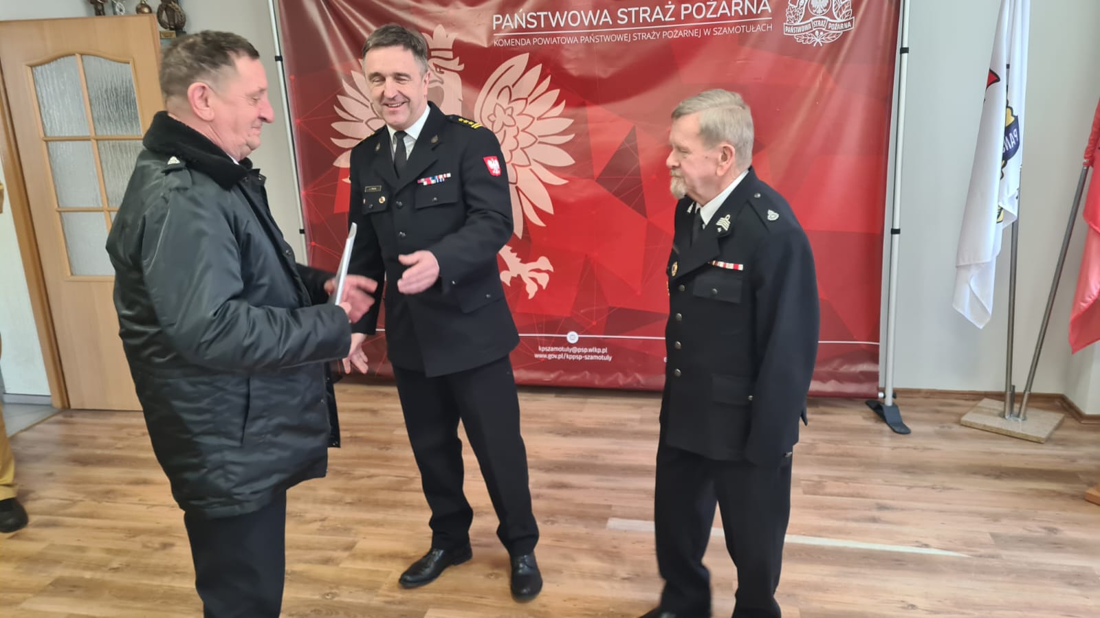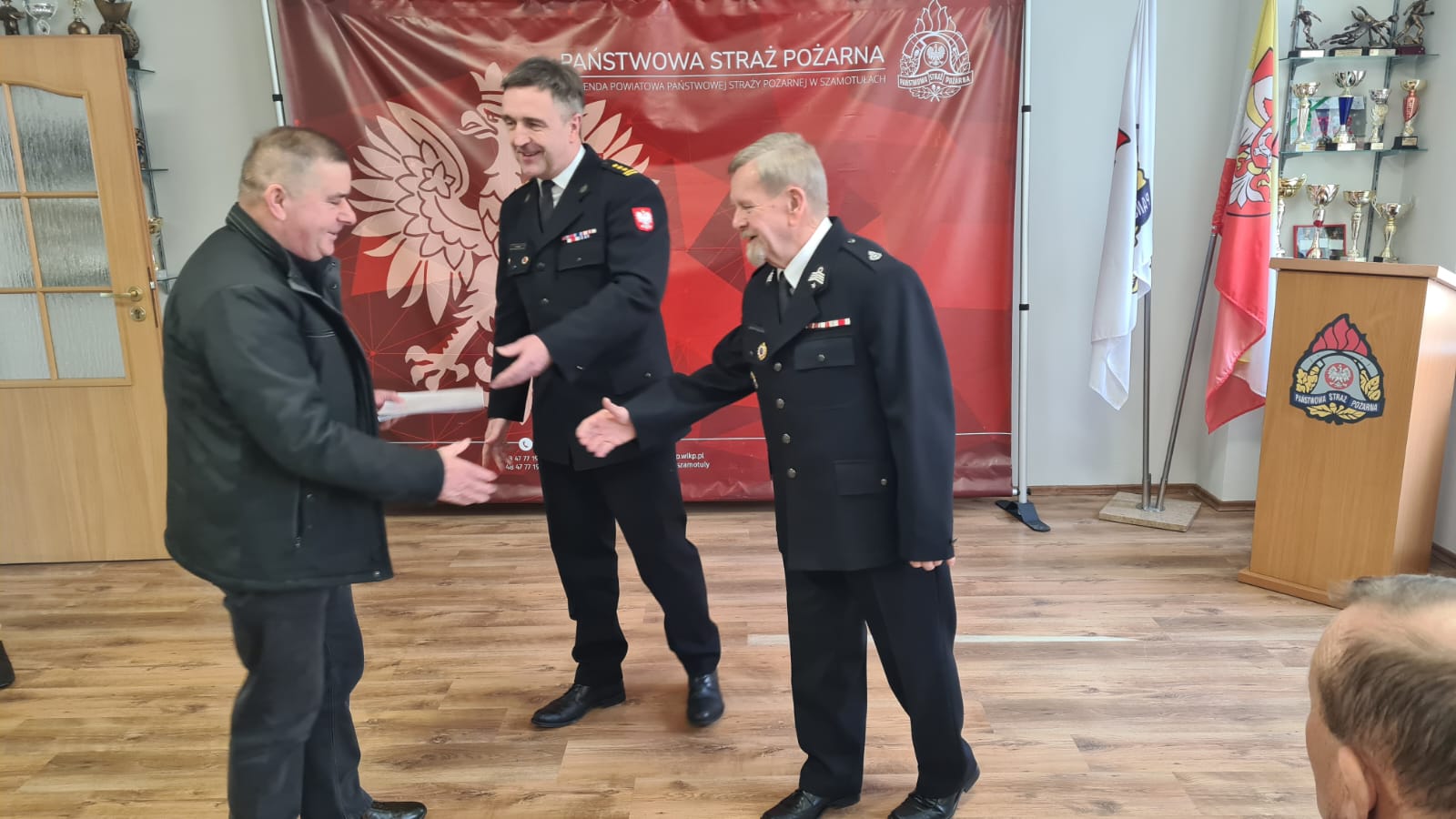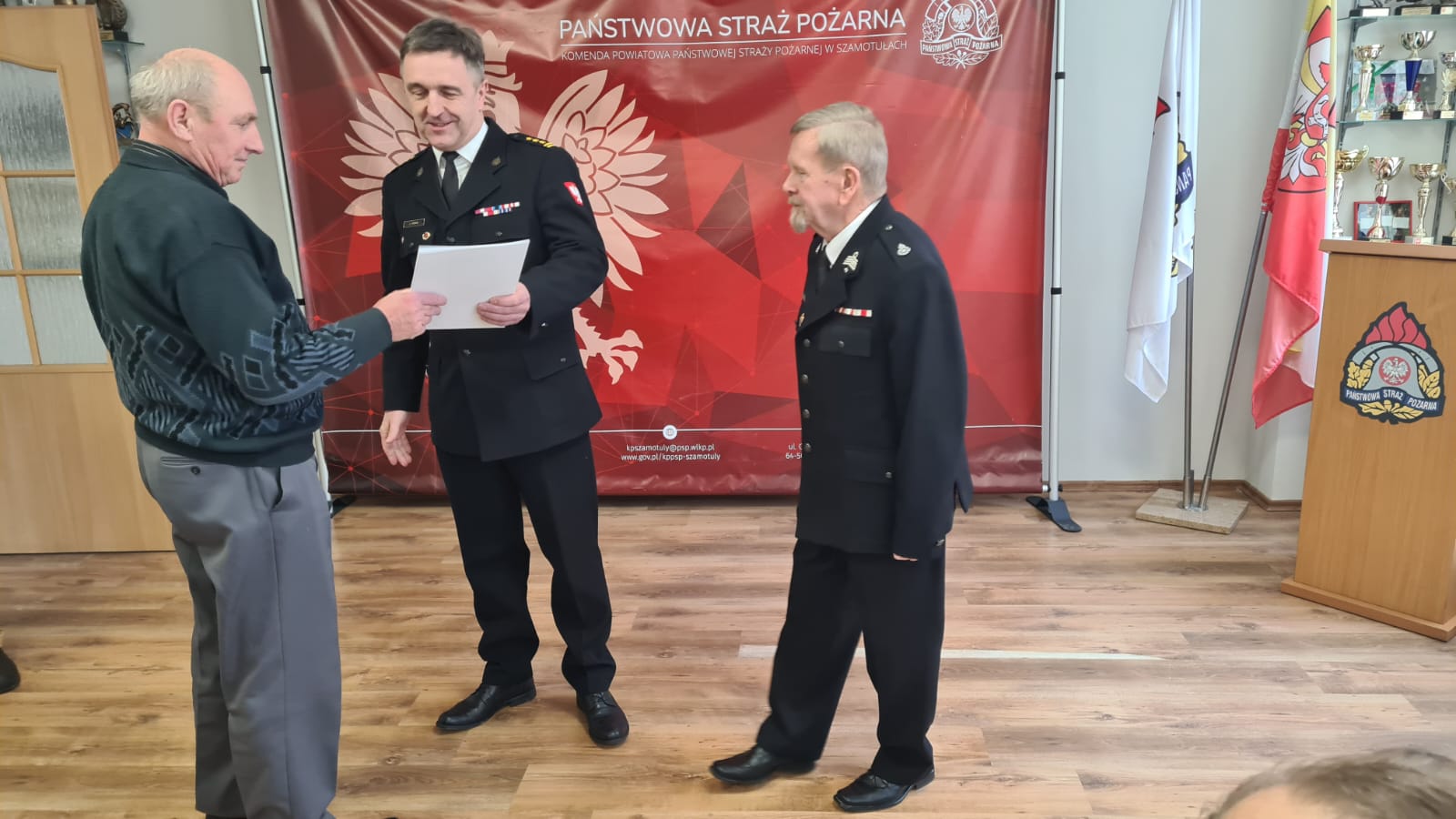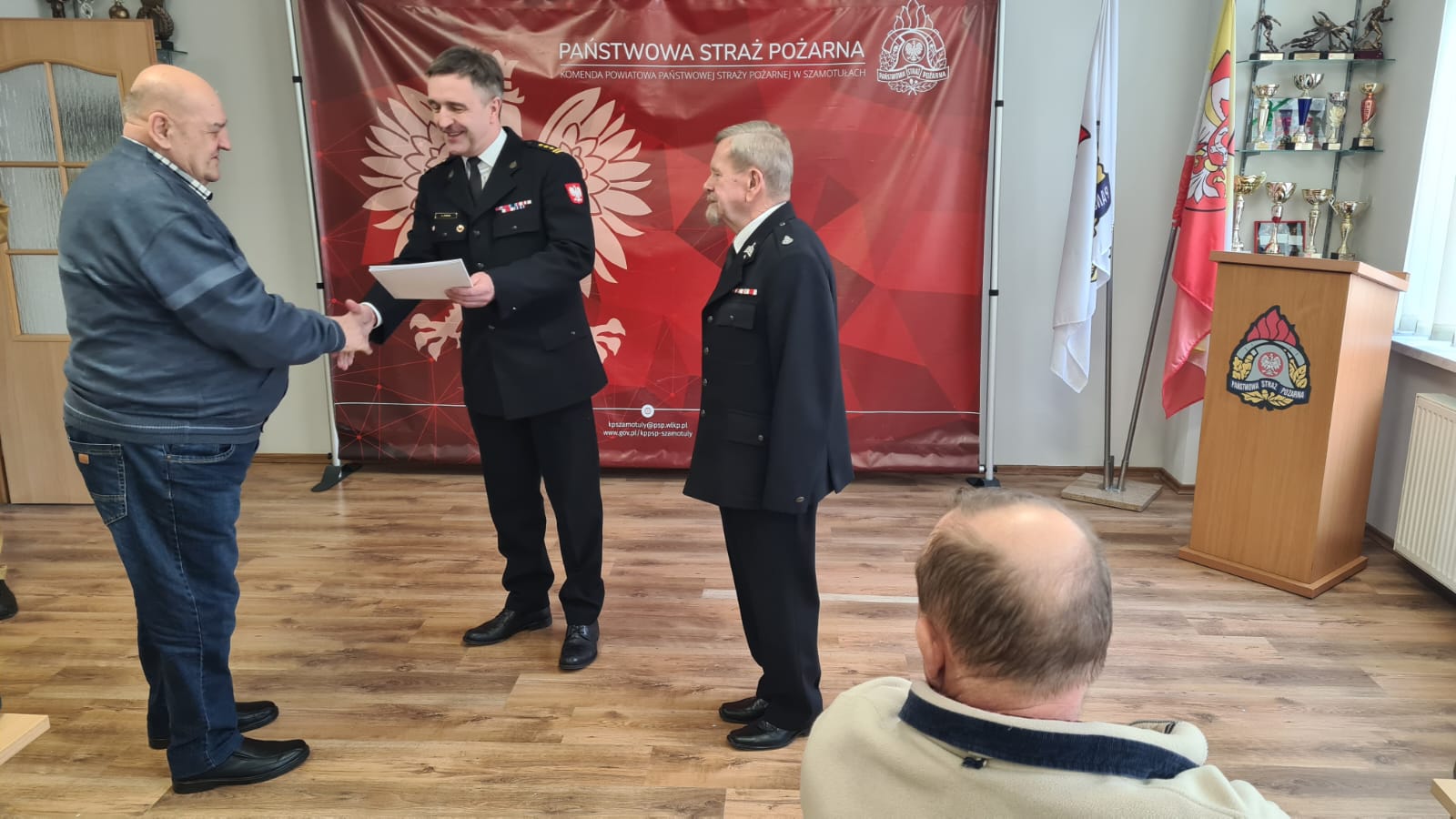 W piątek, 19 stycznia 2024 roku w siedzibie Komendy Powiatowej PSP w Szamotułach strażacy Ochotniczych Straży Pożarnych z powiatu szamotulskiego, którzy ukończyli 65 lat i przez co najmniej 25 lat brali czynny udział w akcjach ratowniczych otrzymali decyzję o przyznaniu świadczenia ratowniczego.