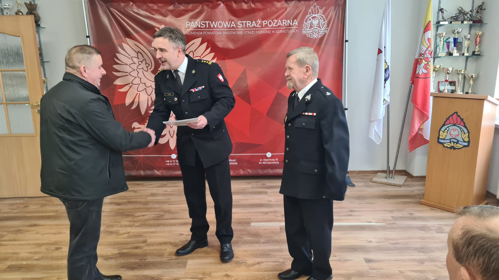 W tym dniu Komendant Powiatowy Państwowej Straży Pożarnej w Szamotułach st. bryg. Ireneusz Pers, Z-ca Komendanta Powiatowego bryg. Arkadiusz Rakowski oraz Prezes Zarządu Oddziału Powiatowego Związku Ochotniczych Straży Pożarnych RP w Szamotułach dh Zenon Pawlaczyk dokonali uroczystego wręczenia decyzji o przyznaniu świadczenia ratowniczego druhom OSP powiatu szamotulskiego z gminy Kaźmierz, Wronki, Ostroróg, Szamotuły, Pniewy oraz Duszniki.