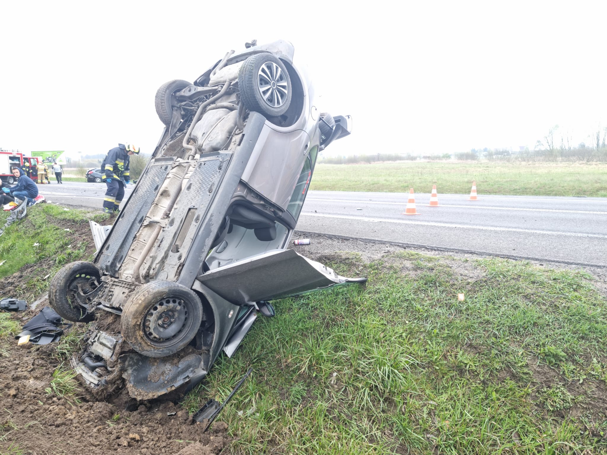 Po dojeździe na miejsce zdarzenia strażacy zastali dwa samochody osobowe, które zderzyły się ze sobą. Kierujący i pasażerowie opuścili pojazdy przed przybyciem SP i znajdowali się w pobliżu pod opieką świadków zdarzenia. Pojazdy znajdowały się w przydrożnym rowie.