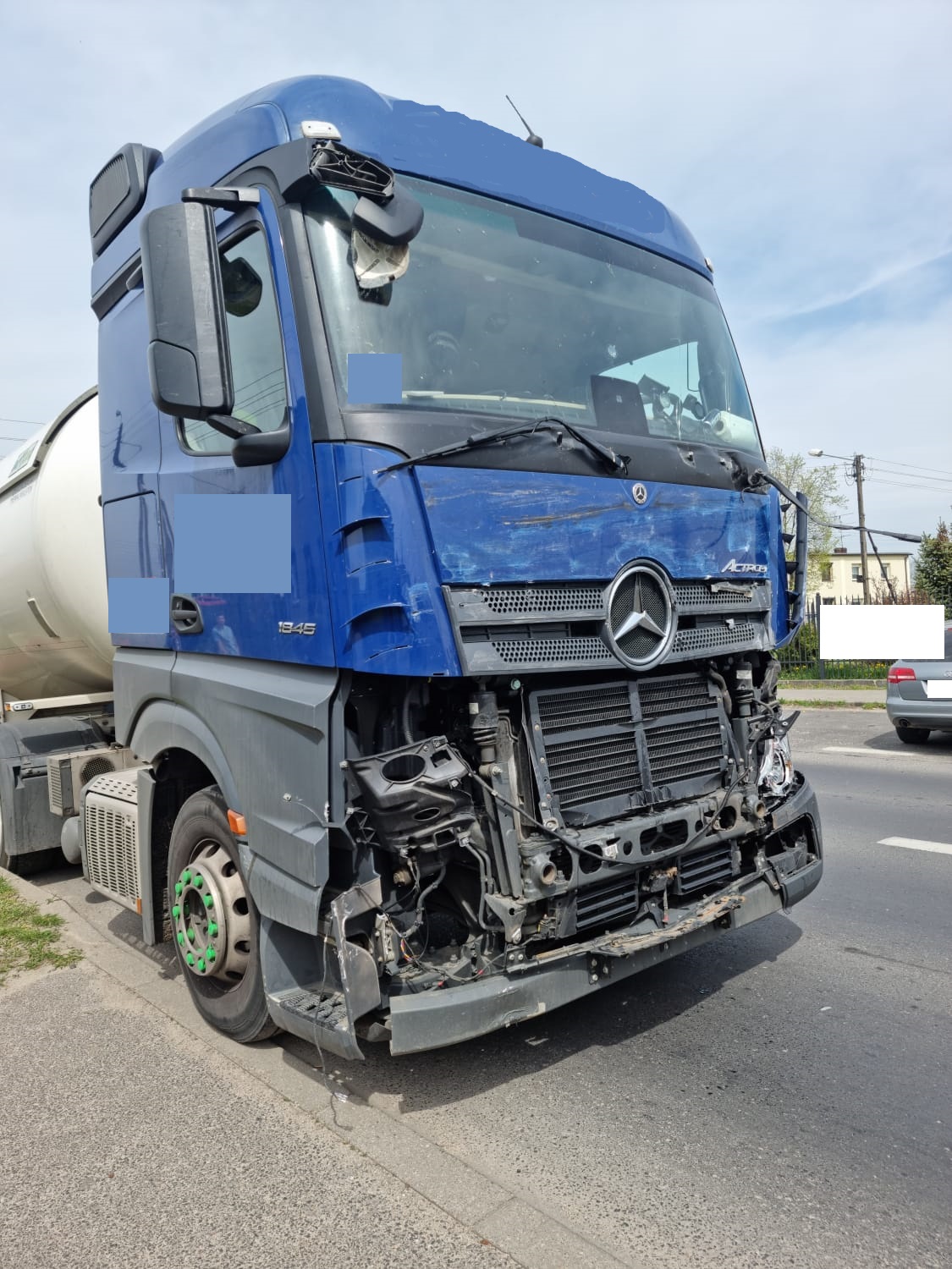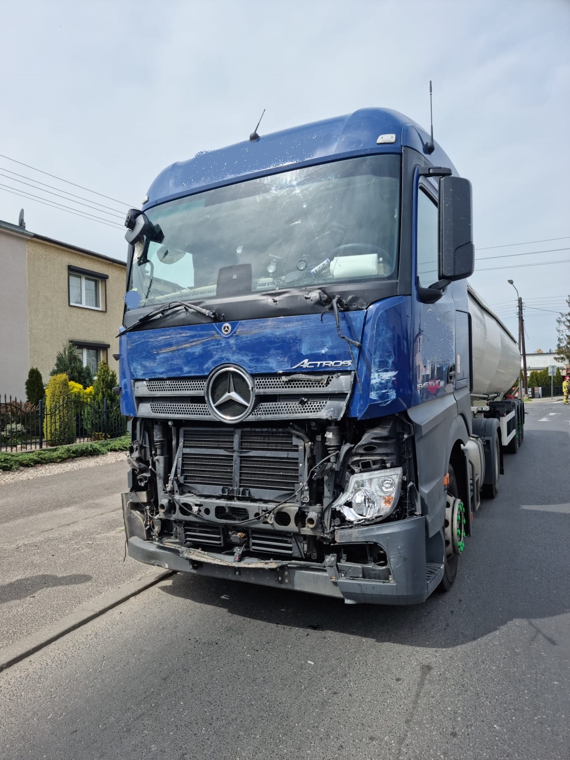 Po dojeździe na miejsce zdarzenia strażacy zastali samochód ciężarowy, który uderzył w prawy bok autobusu. Kierujący i pasażerka opuścili pojazd przed przybyciem SP znajdowali się w pobliżu. Pasażerka została lekko poszkodowana (uraz głowy). KDR poprosił o zadysponowanie na miejsce zdarzenia Zespołu Ratownictwa Medycznego. Autobusem podróżował kierowca i pasażerka. Samochód ciężarowy przewoził w cysternie gaz LPG, cysterna nie została uszkodzona.