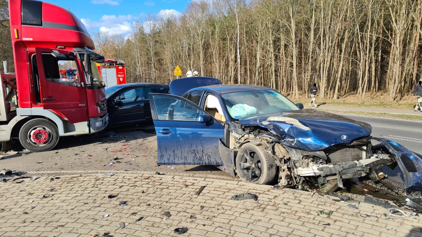Po dojeździe na miejsce zdarzenia ratownicy zastali dwa rozbite samochody osobowe oraz uszkodzony samochód ciężarowy, kierujący oraz pasażerowi samodzielnie opuścili pojazdy przed przybyciem SP i znajdowali się w pobliżu. Na polecenie KDR na miejsce zadysponowano Zespół Ratownictwa Medycznego.