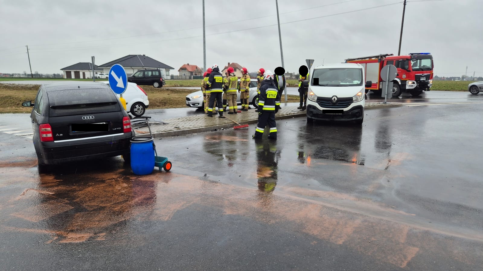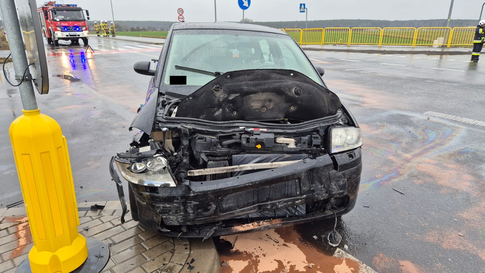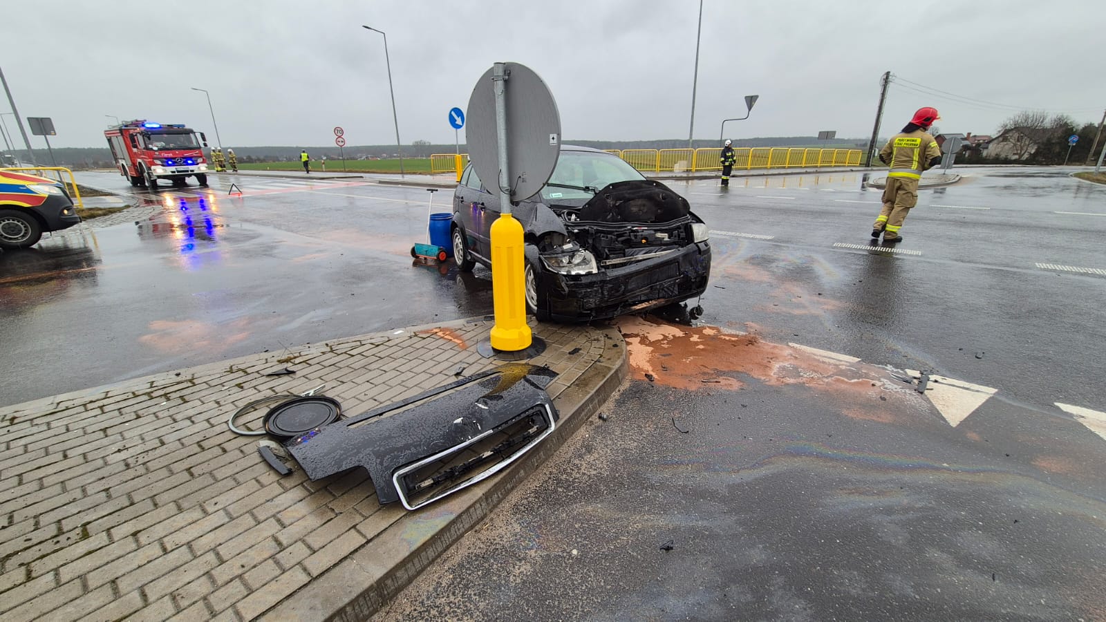 Po dojeździe na miejsce zdarzenia strażacy zastali dwa samochody osobowe, które zderzyły się na skrzyżowaniu. Kierujący opuścili pojazdy przed przybyciem SP i znajdowali się w pobliżu. Jedna osoba poszkodowana (kobieta) znajdowała się pod opieką ratowników ZRM.