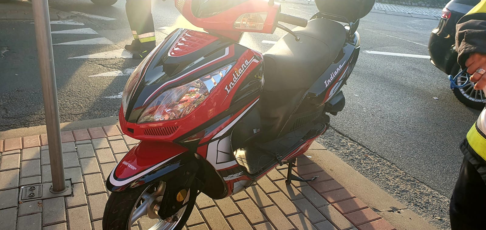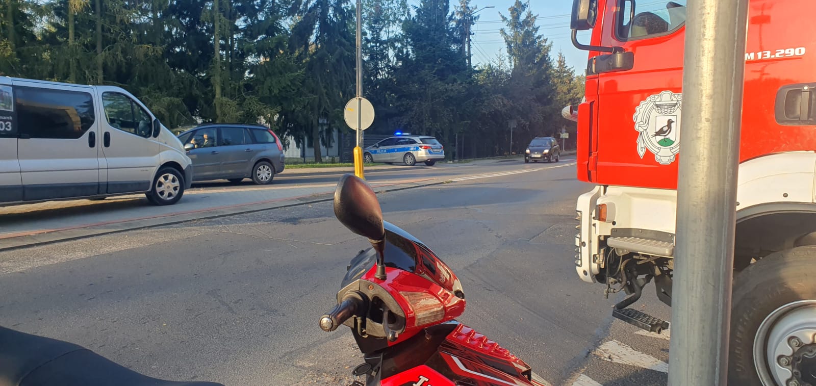 Po dojeździe na miejsce zdarzenia strażacy zastali skuter, który uderzył w bok samochodu osobowego. Kierujący pojazdami znajdowali się na poboczu drogi.