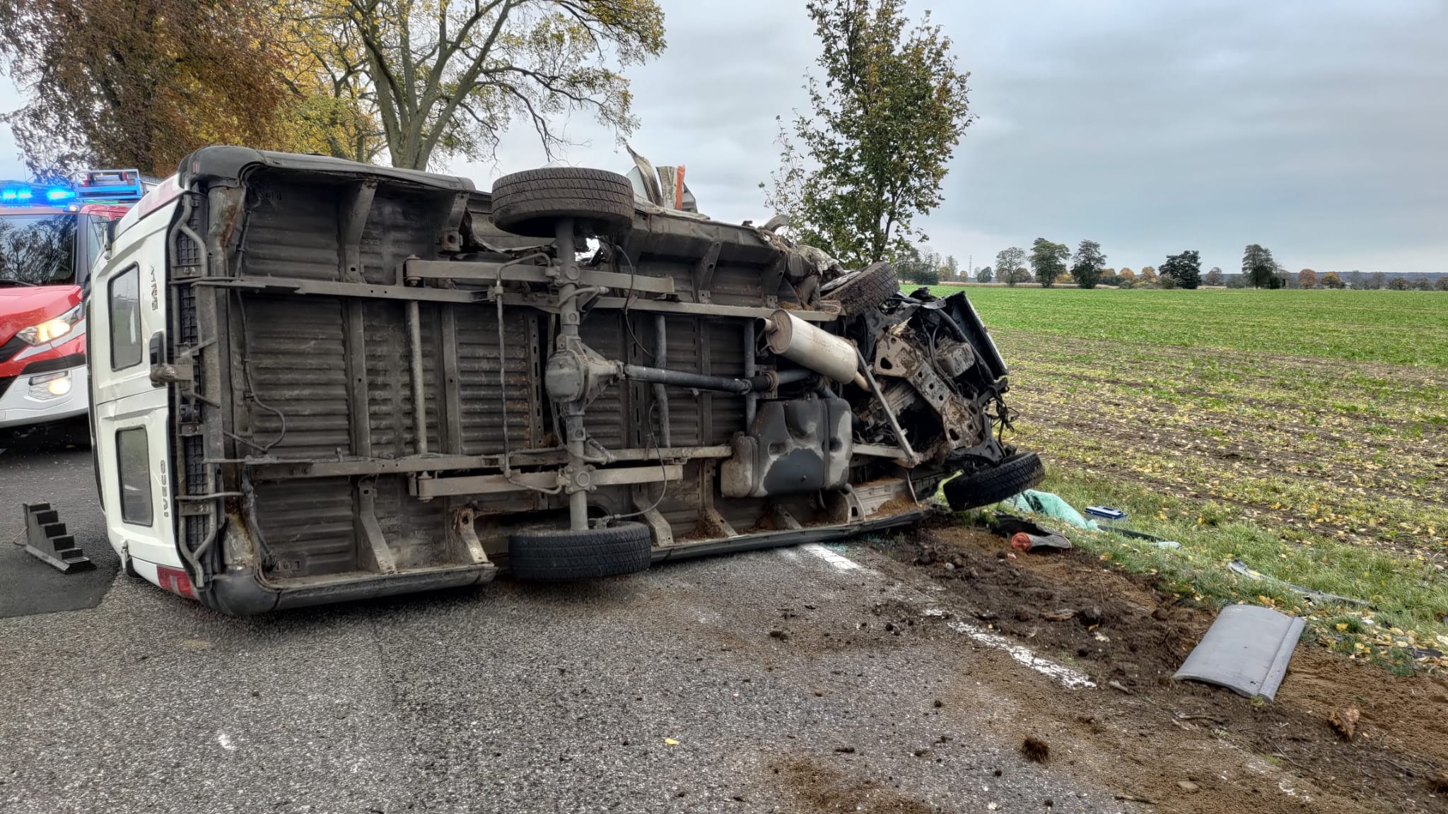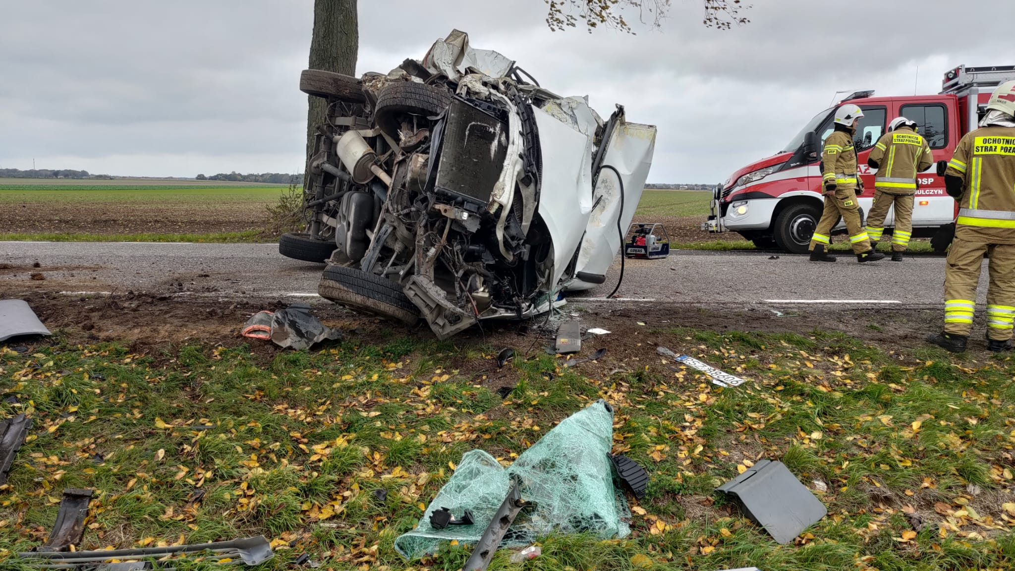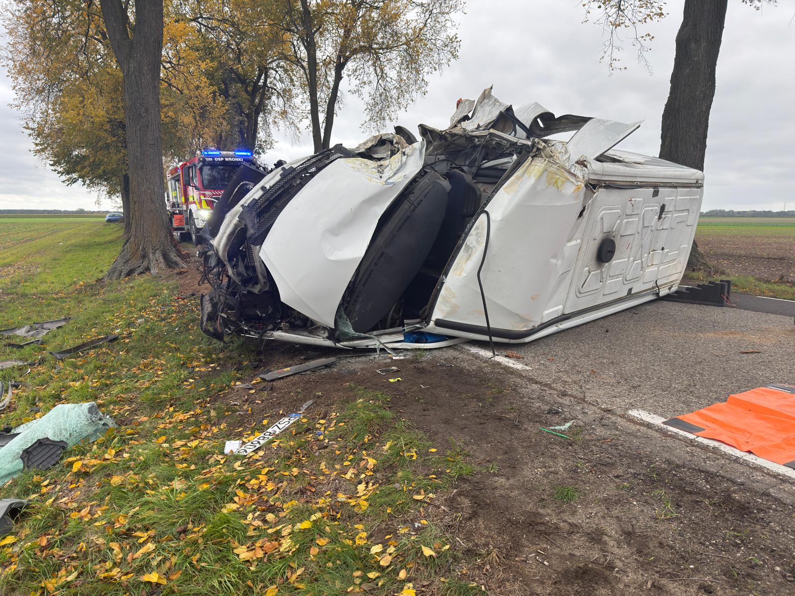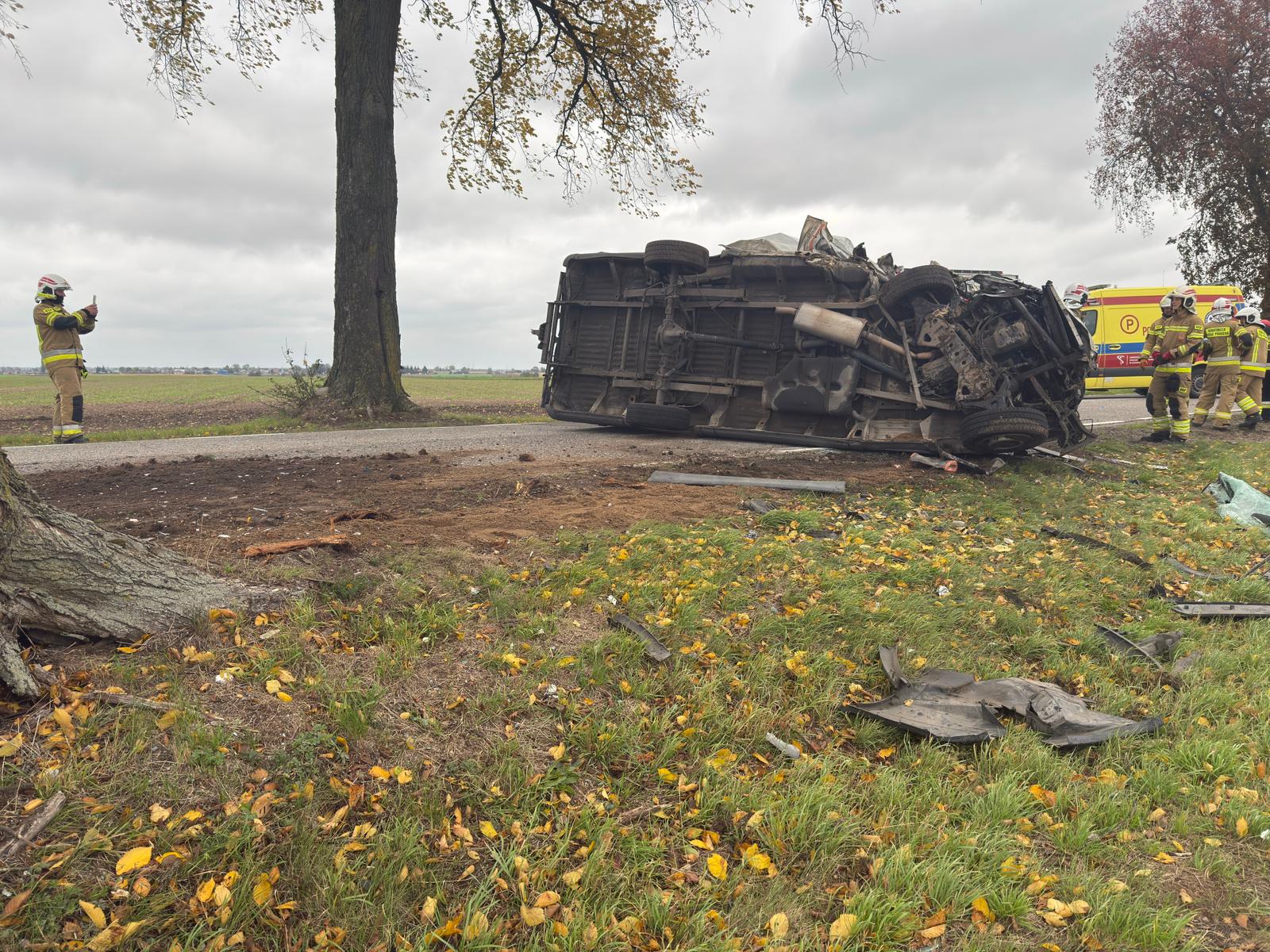 Po dojeździe na miejsce zdarzenia strażacy zastali samochód dostawczy marki Iveco, który po uderzeniu w drzewo znajdował się na lewym boku na drodze. Kierujący znajdował się uwięziony wewnątrz pojazdu.