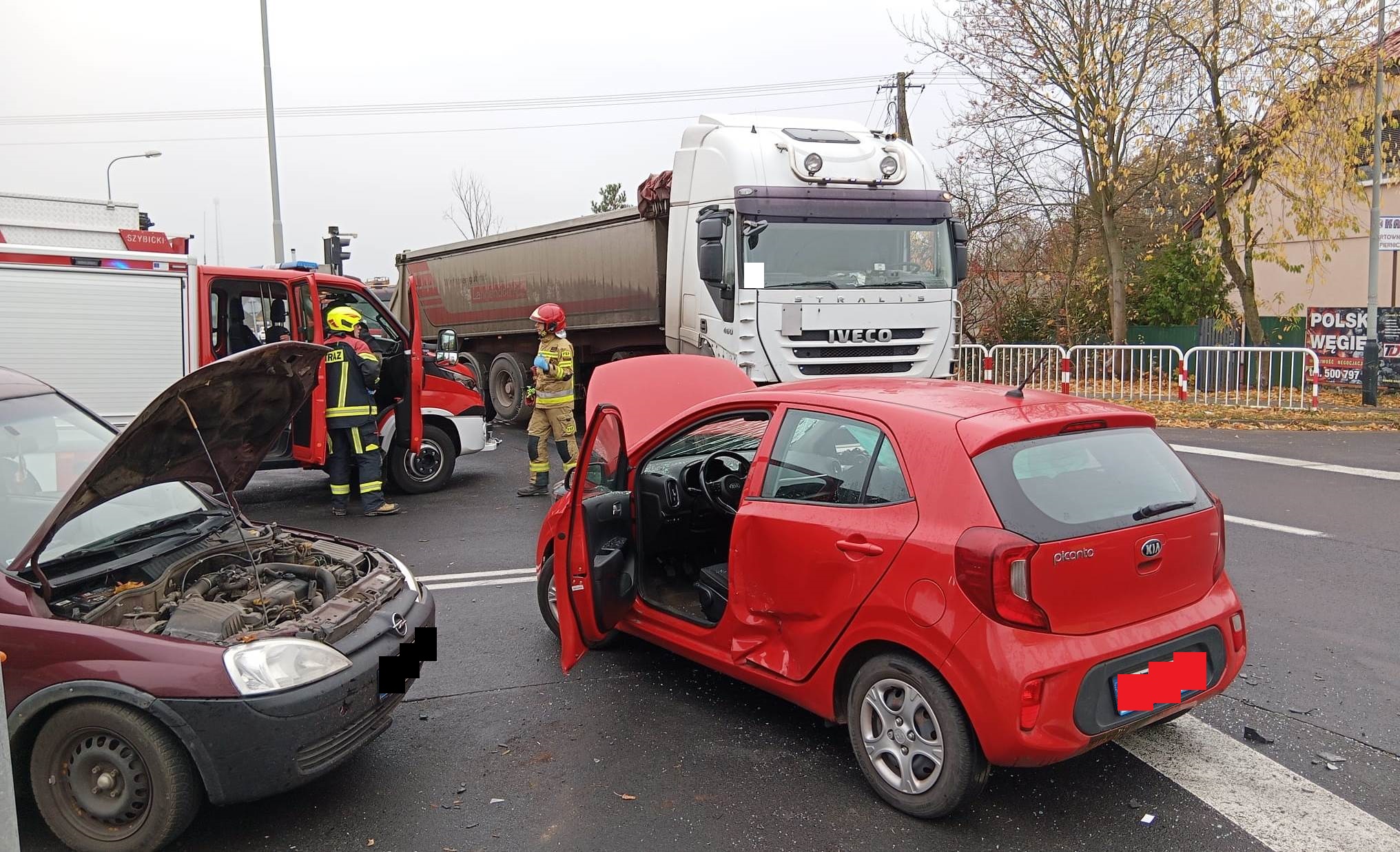 Po dojeździe na miejsce zdarzenia strażacy zastali pojazd ciężarowy, który uderzył w bok samochodu osobowego, dodatkowo uszkodzony został samochód dostawczy. Kierujący opuścili pojazdy przed przybyciem SP i znajdowali się w pobliżu.