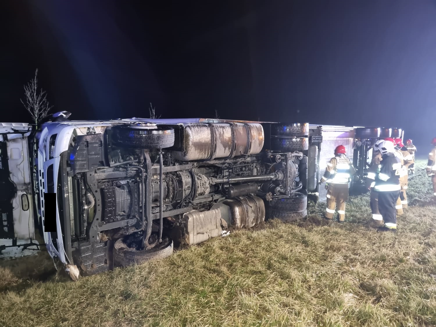 Po dojeździe na miejsce zdarzenia strażacy zastali przewrócony samochód ciężarowy z naczepą, który znajdował się poza drogą. Osoba poszkodowana znajdowała się wewnątrz pojazdu.