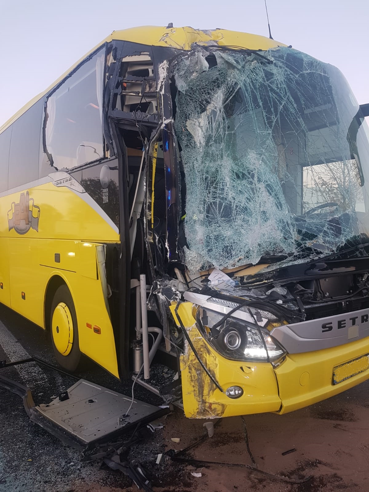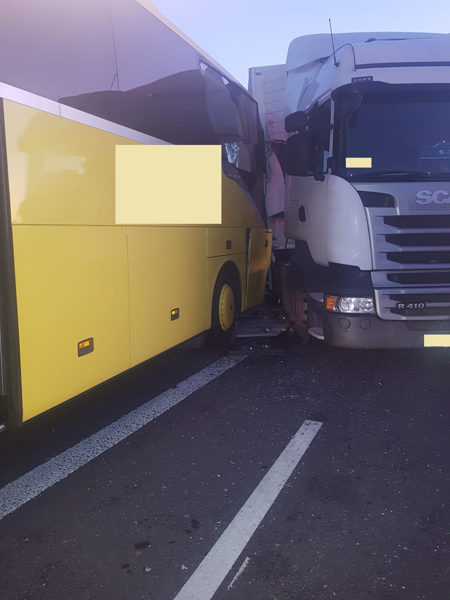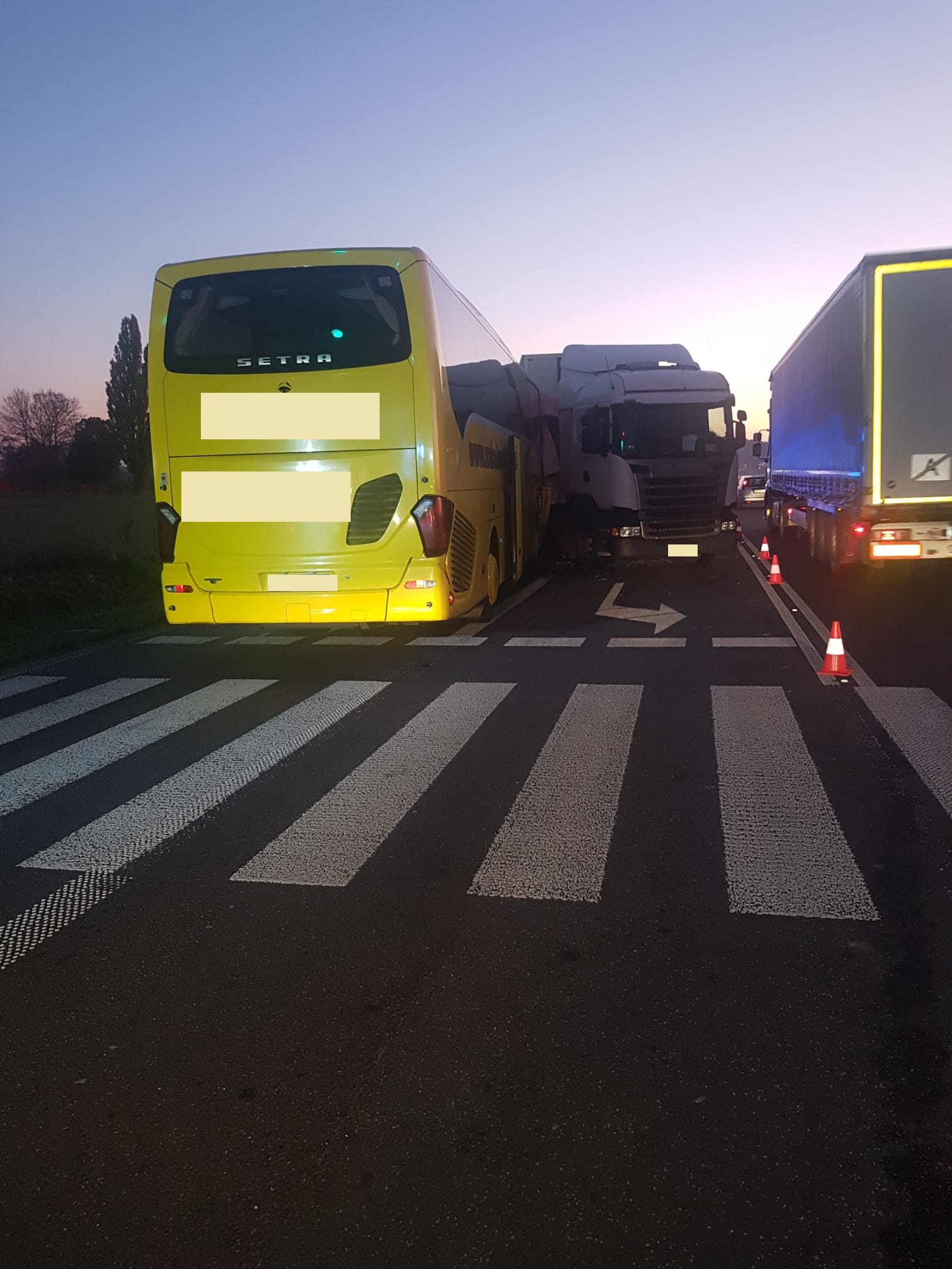 Po dojeździe na miejsce zdarzenia strażacy zastali autobus, który zderzył się z pojazdem ciężarowym, jedna osoba poszkodowana znajdowała się pod opieką ratowników ZRM, pozostałe osoby podróżujące autobusem oraz kierowca samochodu ciężarowego nie odnieśli obrażeń.