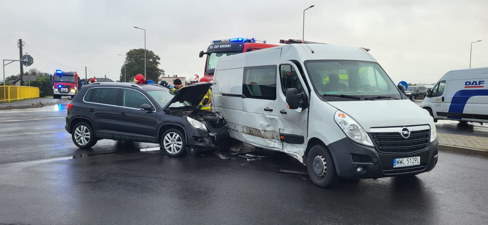 Po dojeździe na miejsce zdarzenia strażacy zastali samochód osobowa marki Volkswagen, który uderzył w prawy bok pojazdu Opel. Kierujący i pasażerowie opuścili pojazdy przed przybyciem SP i znajdowali się w pobliżu. Jedna osoba została poszkodowana.