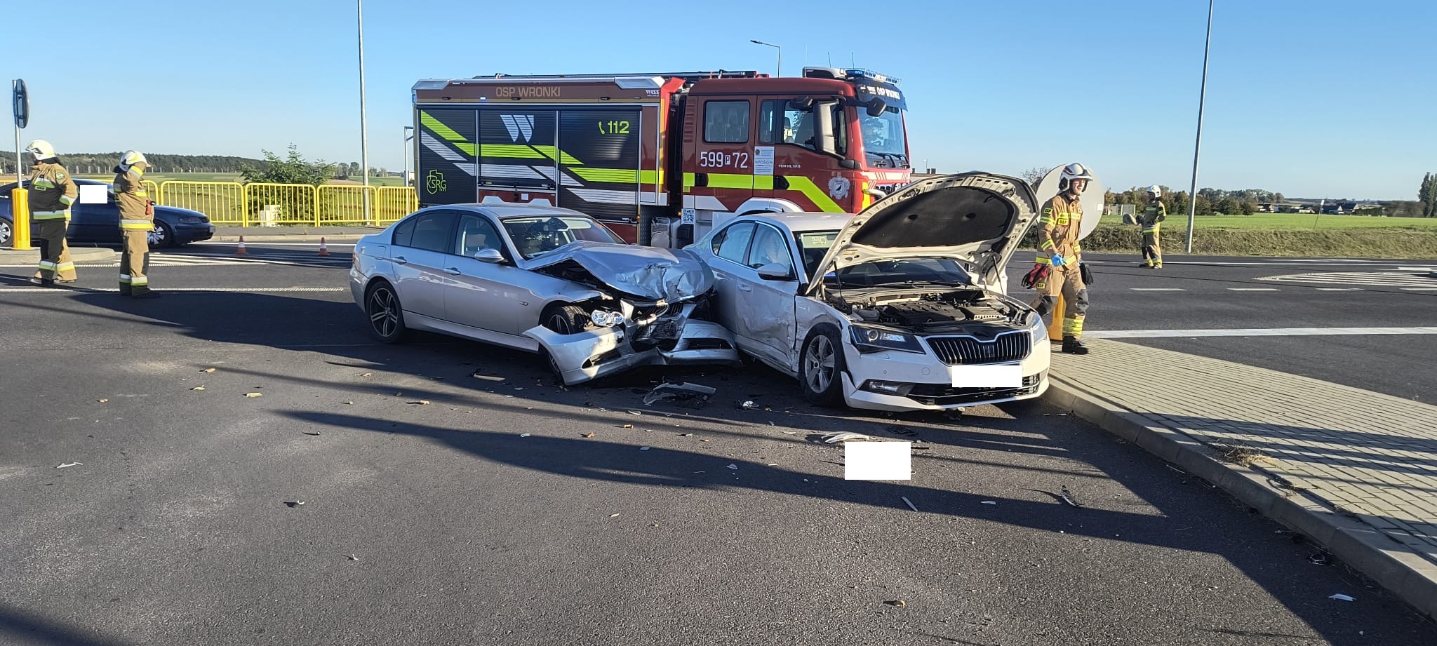 Po dojeździe na miejsce zdarzenia strażacy zastali samochód osobowa marki BMW, który uderzył w prawy bok pojazdu Skoda. Kierujący i pasażerowie opuścili pojazdy przed przybyciem SP i znajdowali się w pobliżu.