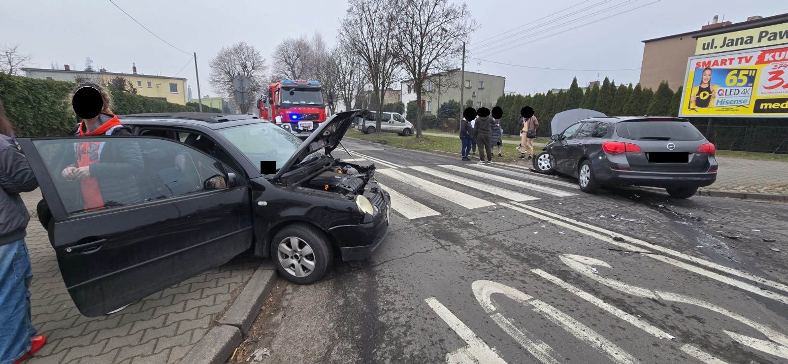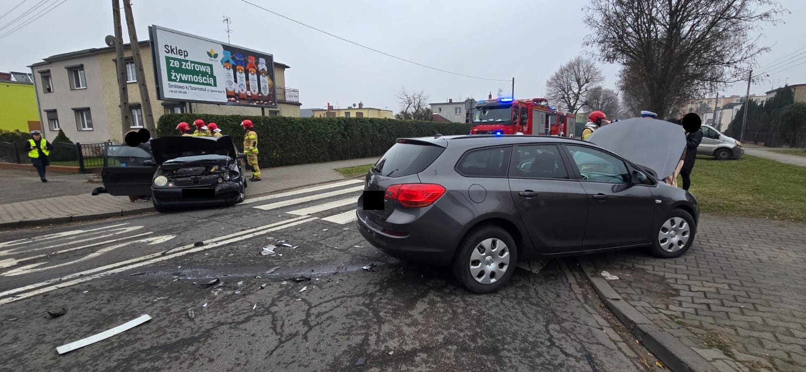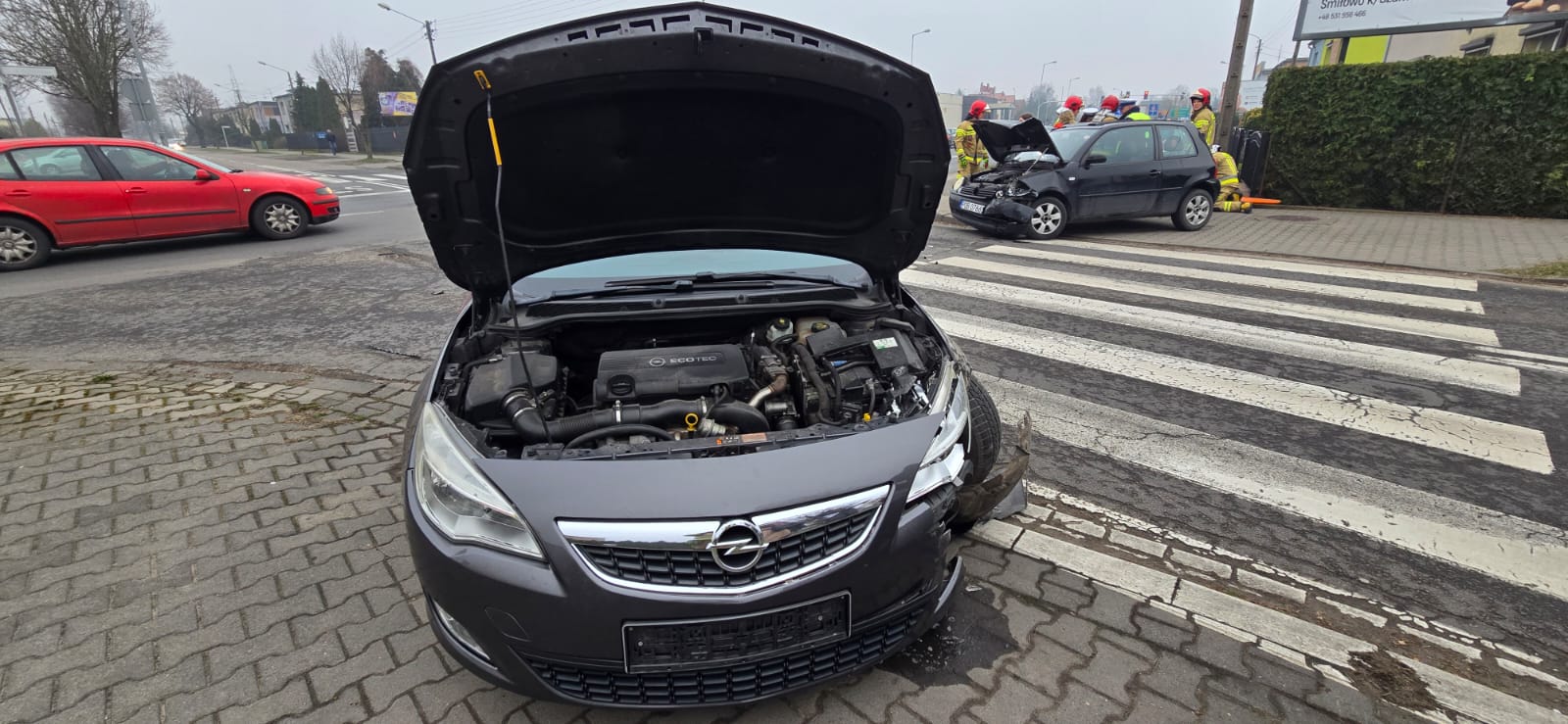 Po dojeździe na miejsce zdarzenia strażacy zastali dwa samochody osobowe, które zderzyły się na skrzyżowaniu. Kierujący i pasażerowie opuścili pojazdy przed przybyciem SP i znajdowali się w pobliżu.