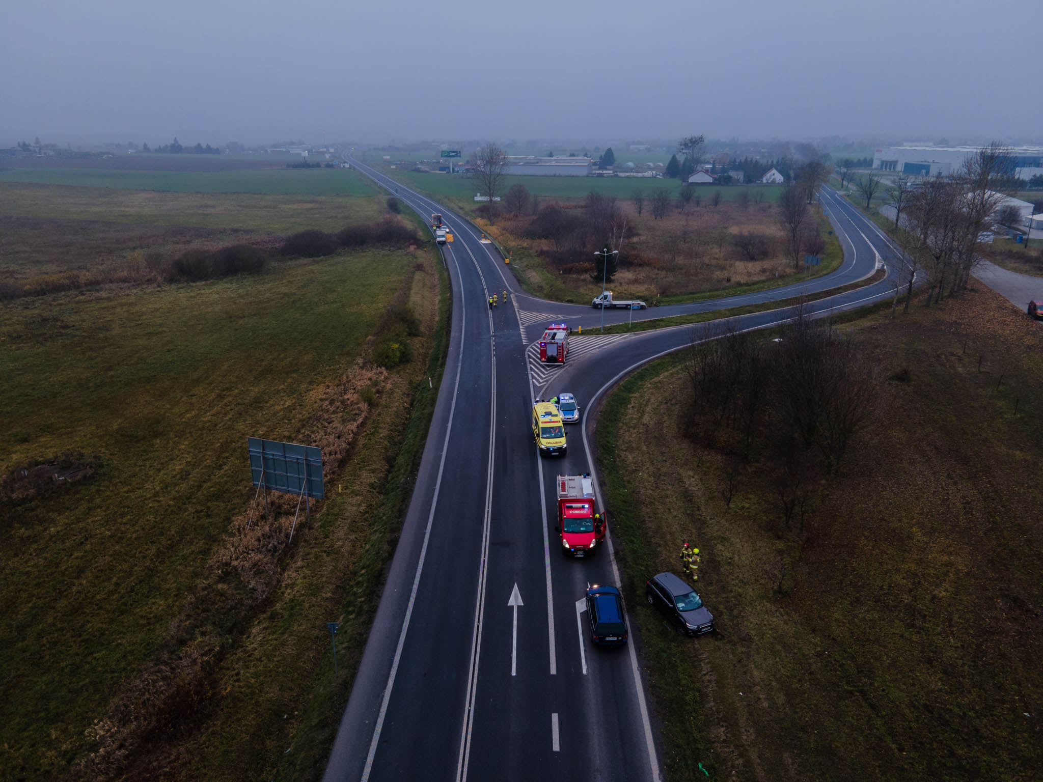 Działania SP polegały na zabezpieczeniu miejsca zdarzenia, rozłączeniu akumulatorów w uszkodzonych pojazdach, pomocy Policji w kierowaniu ruchem drogowym oraz sorpcji płynów eksploatacyjnych.