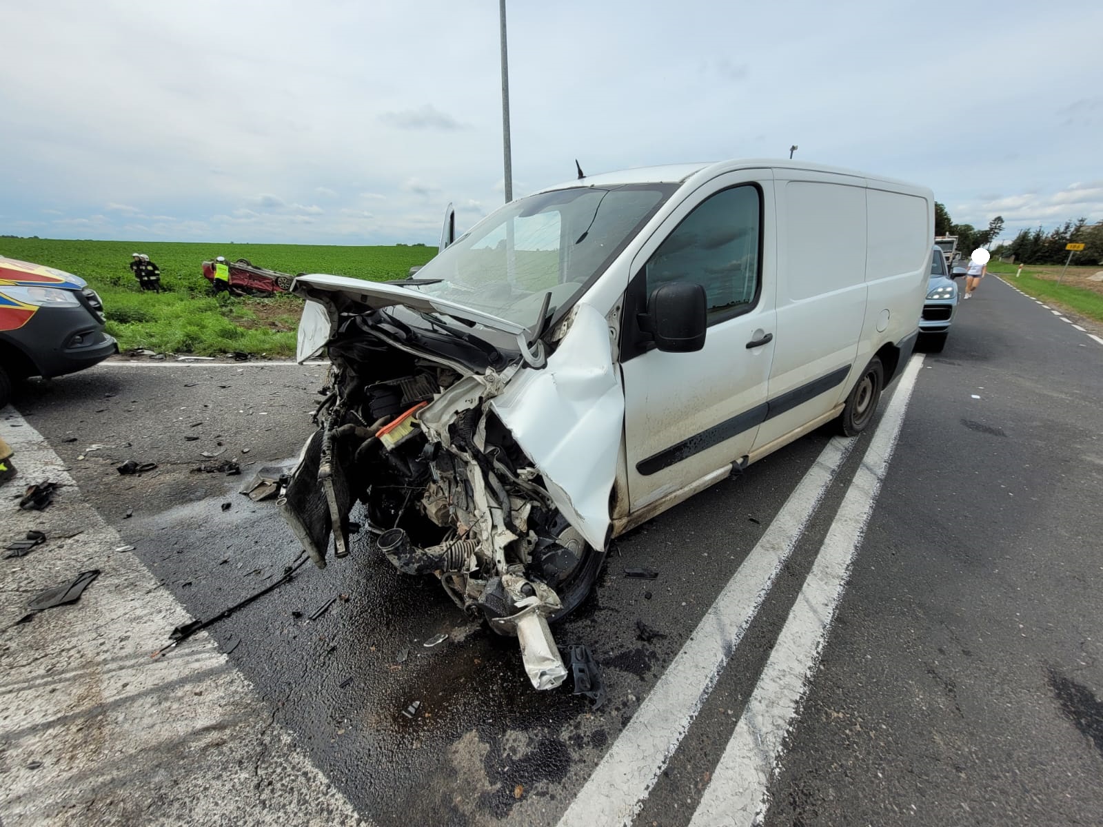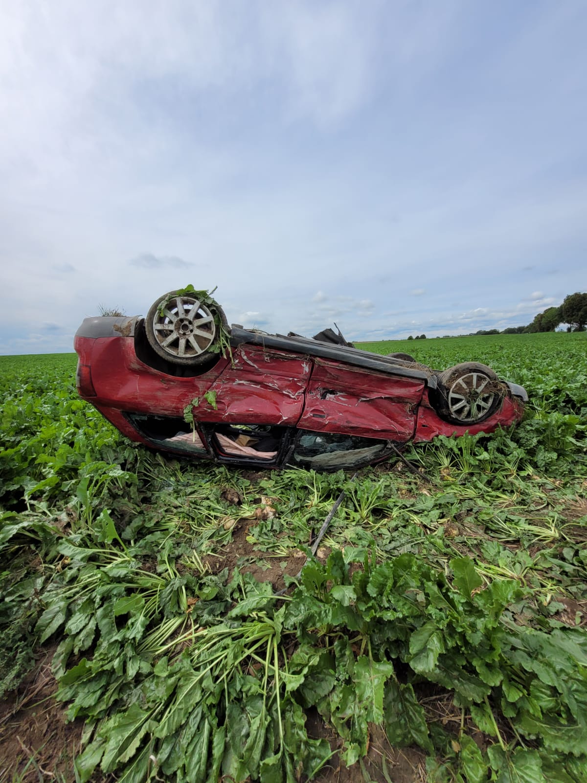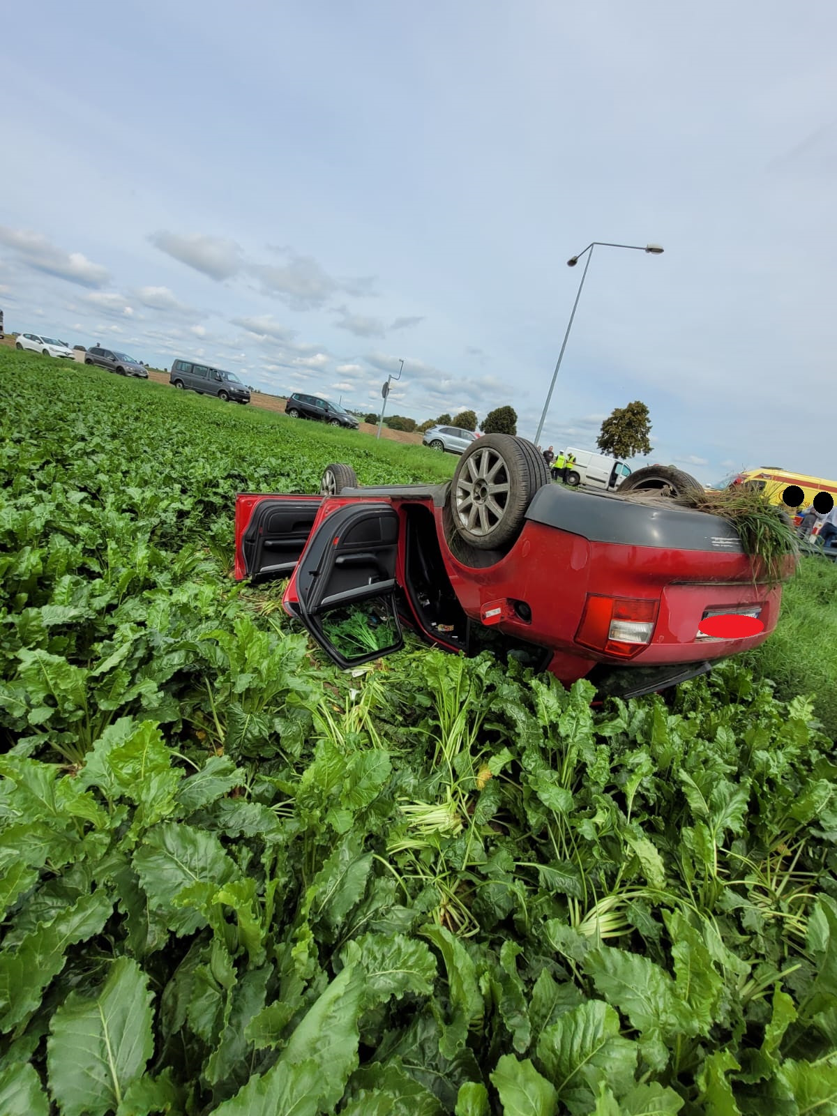 Pojazd marki Fiat znajdował się na środku skrzyżowania, natomiast Audi znajdowało się po dachowaniu na pobliskim polu.