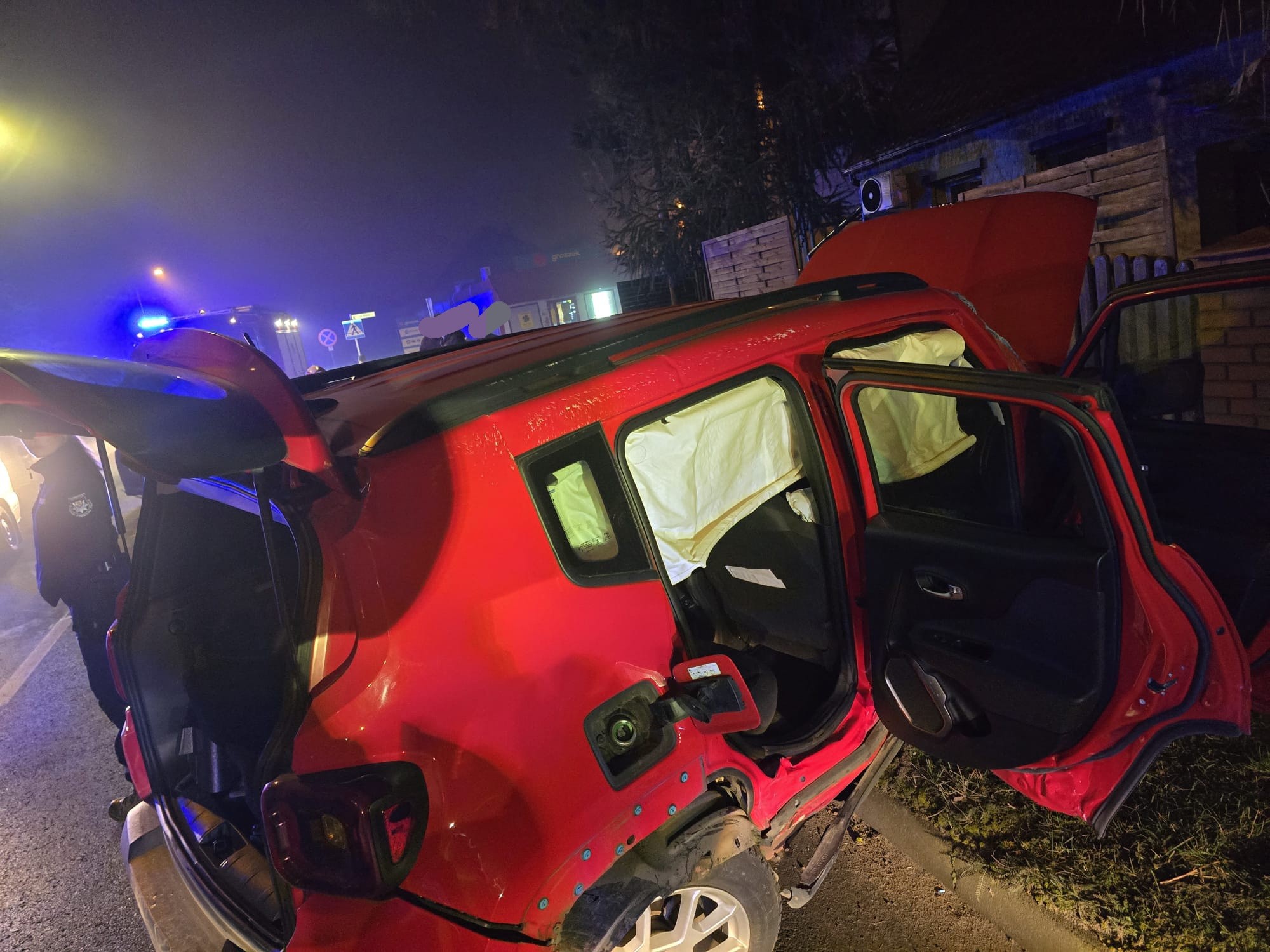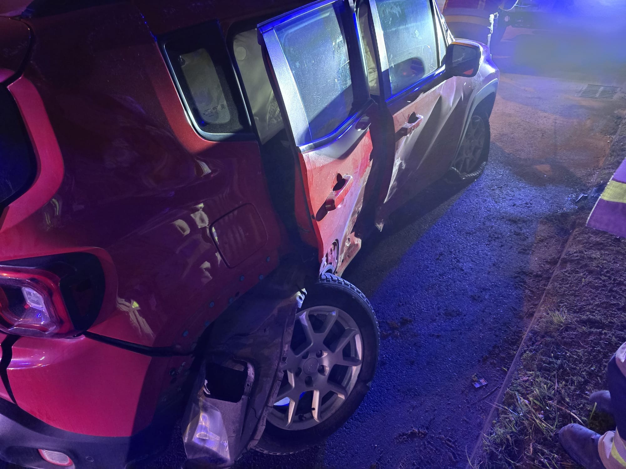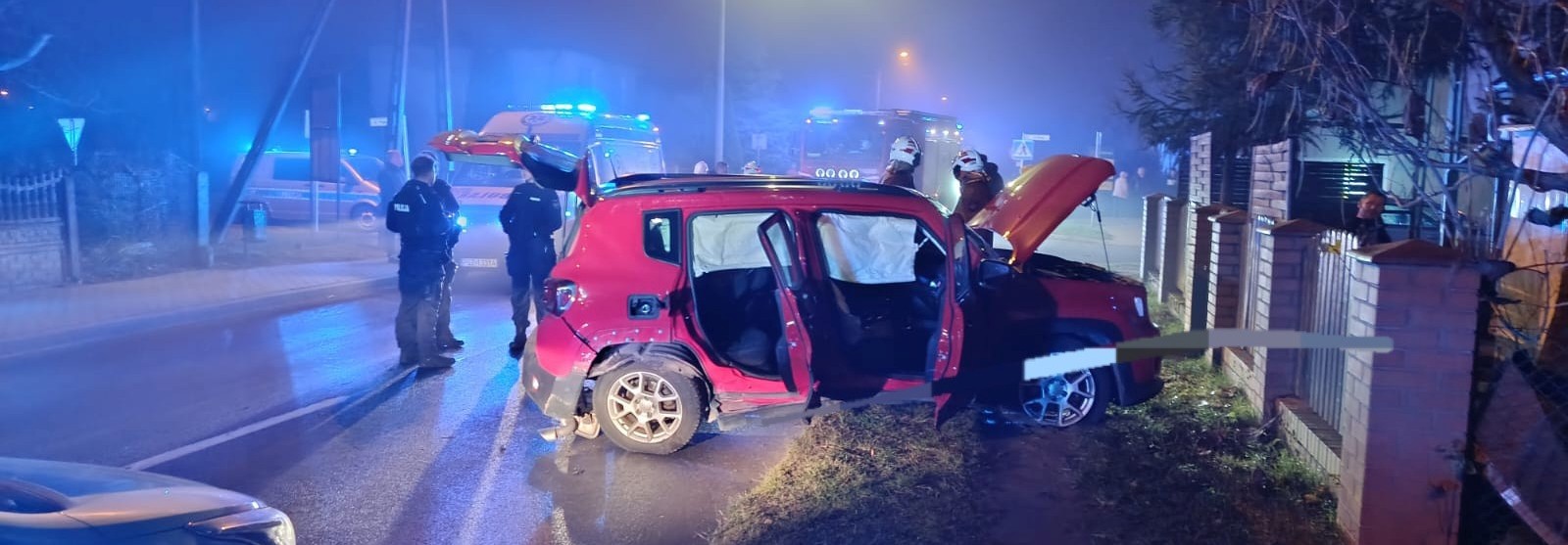 Po dojeździe na miejsce zdarzenia strażacy zastali samochód osobowa marki Jeep, który po dachowaniu znajdował się na poboczu, natomiast pojazd marki VW Golf znajdował się na drodze.