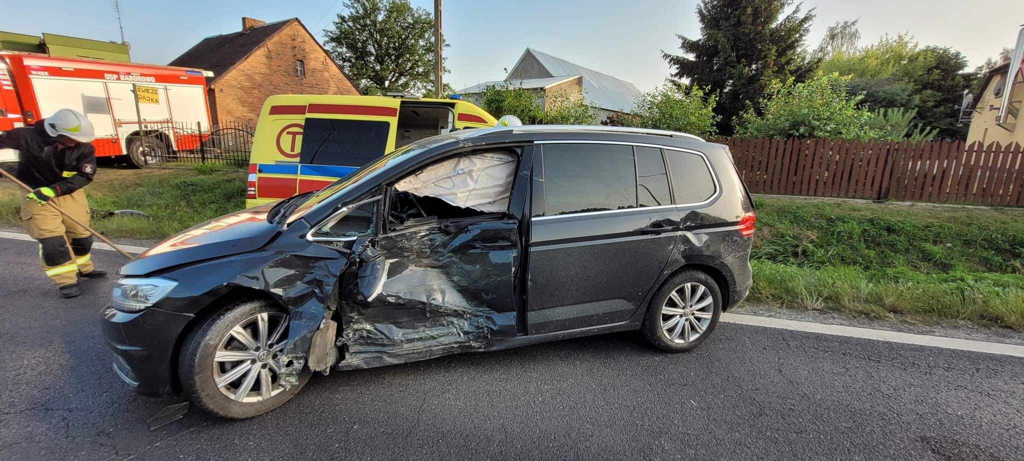 Po dojeździe na miejsce zdarzenia strażacy zastali karetkę Pogotowia Ratunkowego, która znajdowała sie w przydrożnym rowie, natomiast uszkodzony samochód osobowy znajdował się na drodze. Kierujący i pasażer opuścili pojazdy przed przybyciem SP i znajdowali się w pobliżu.