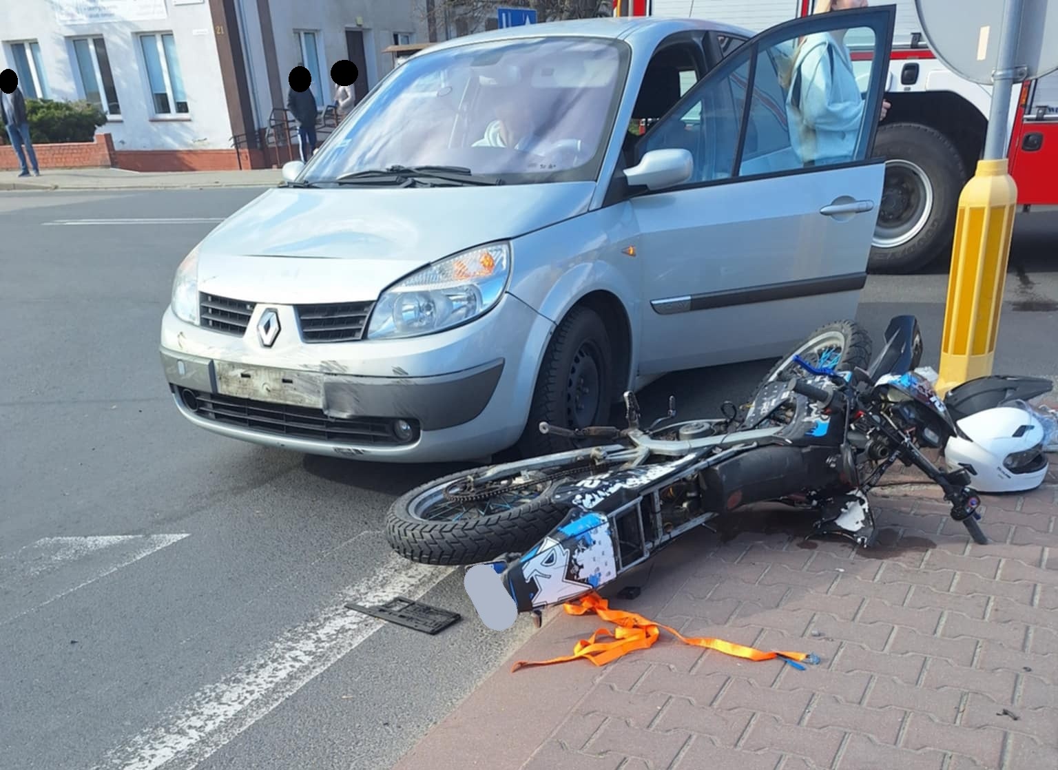 Zderzenie motocykla z samochodem osobowym, poszkodowany mężczyzna przewieziony do szpitala