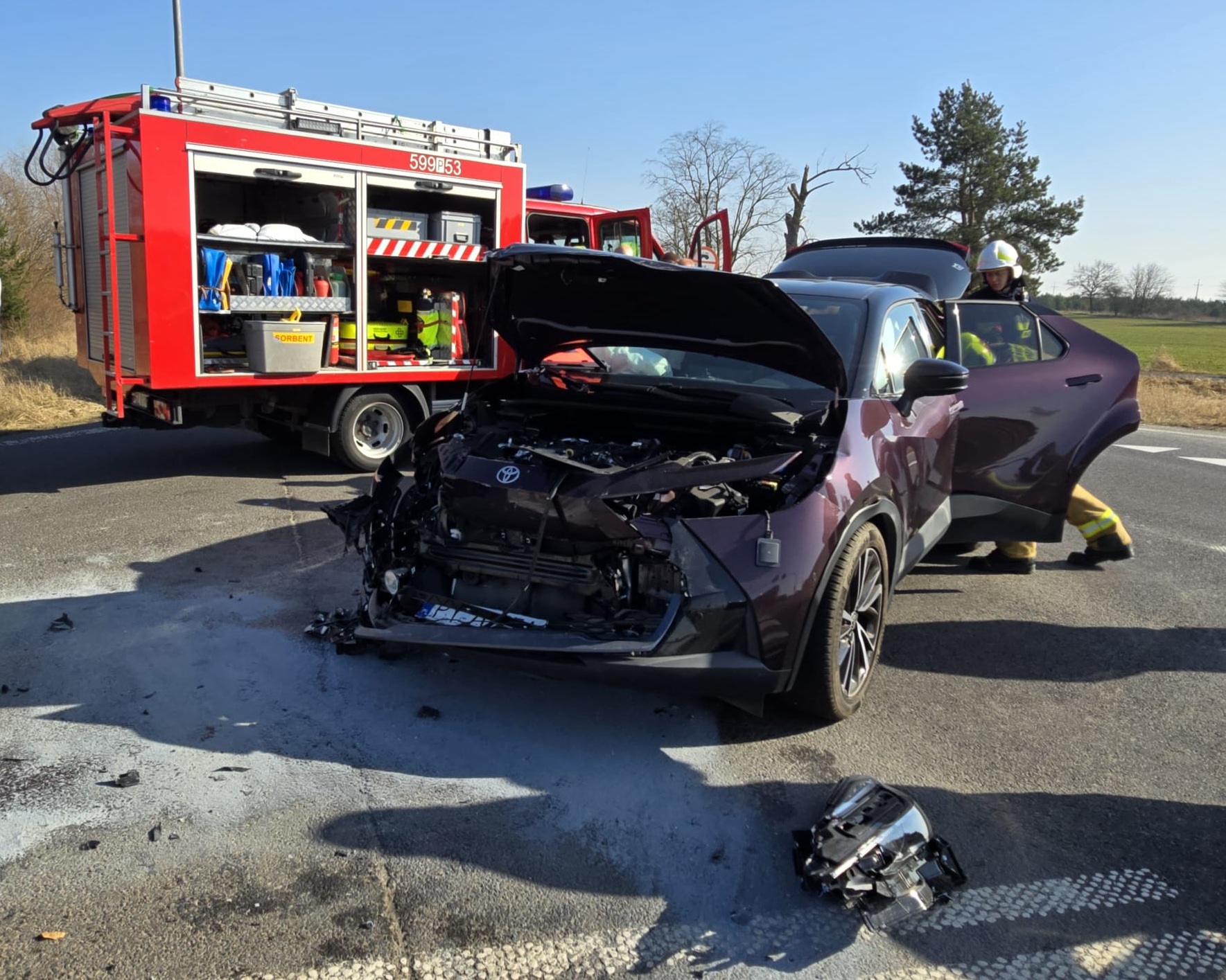 Po przybyciu na miejsce służby stwierdziły, że samochód osobowy marki Toyota zderzył się z pojazdem marki Jeep. Uczestnicy zdarzenia opuścili pojazdy przed przybyciem SP i znajdowali się w pobliżu.