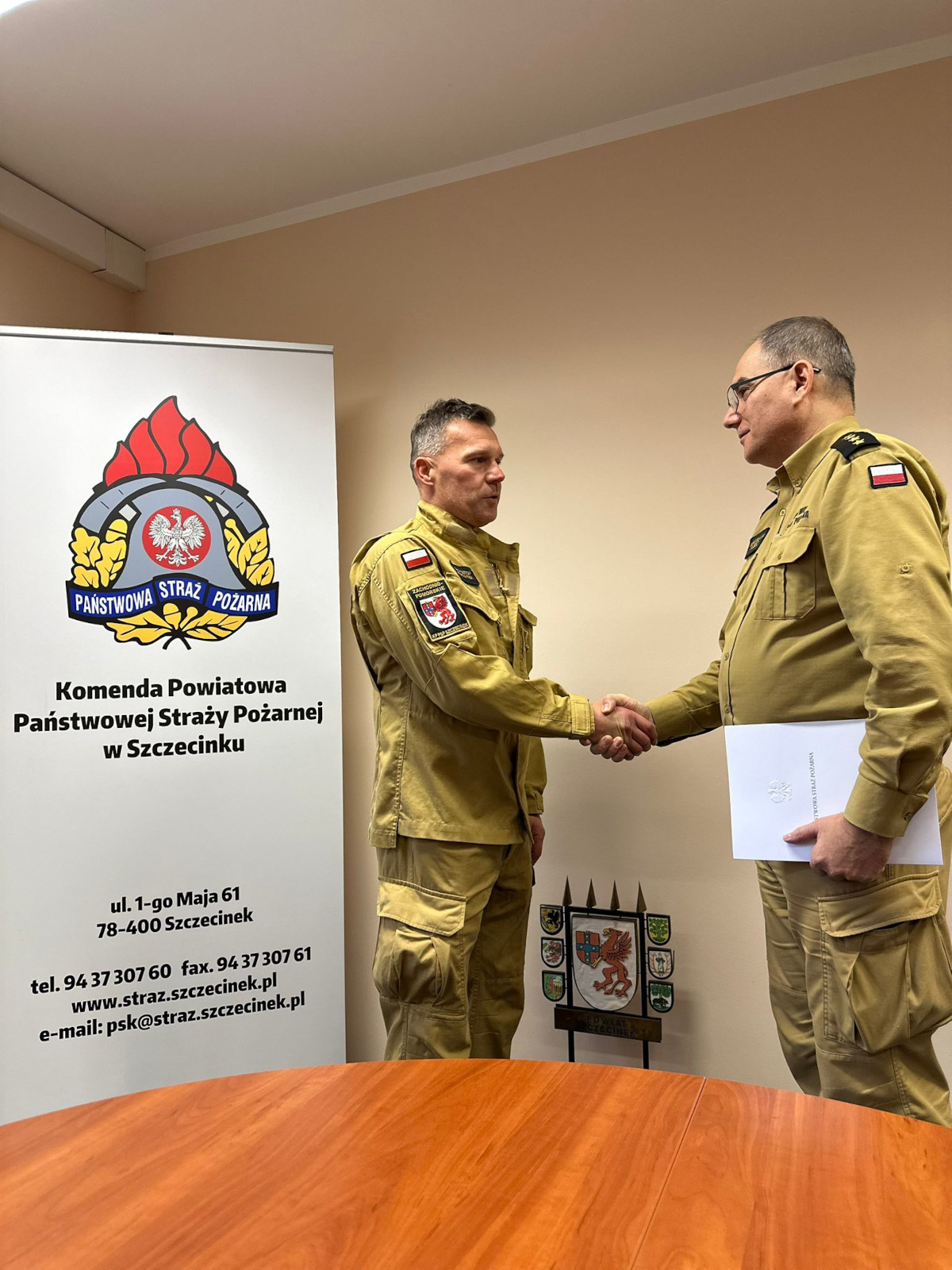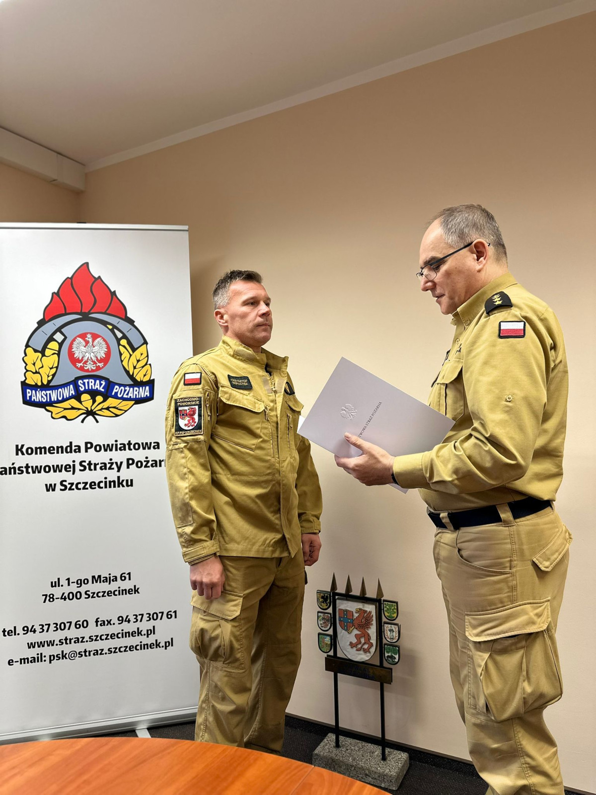 12 listopada 2025 roku Komendant Powiatowy Państwowej Straży Pożarnej w Szczecinku st. kpt. Mirosław Śledź w obecności funkcjonariuszy Komendy Powiatowej PSP w Szczecinku, wręczył nagrodę jubileuszową za 30 lat pracy i służby st. ogn. Krzysztofowi Bernatek, dowódcy zastępu.