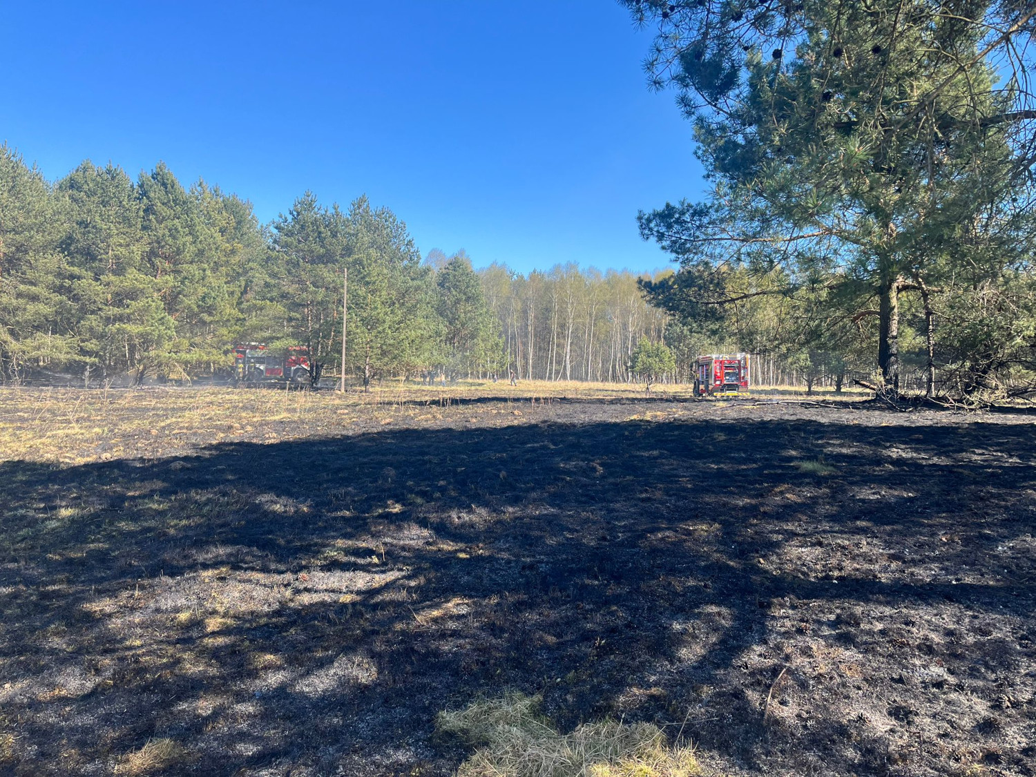 Pożar trawy w pobliżu lasu i budynków gospodarczych.