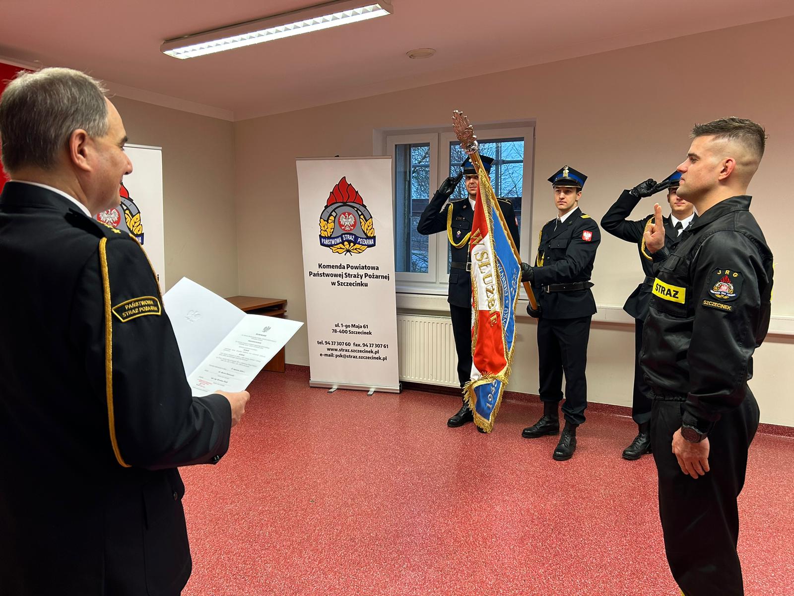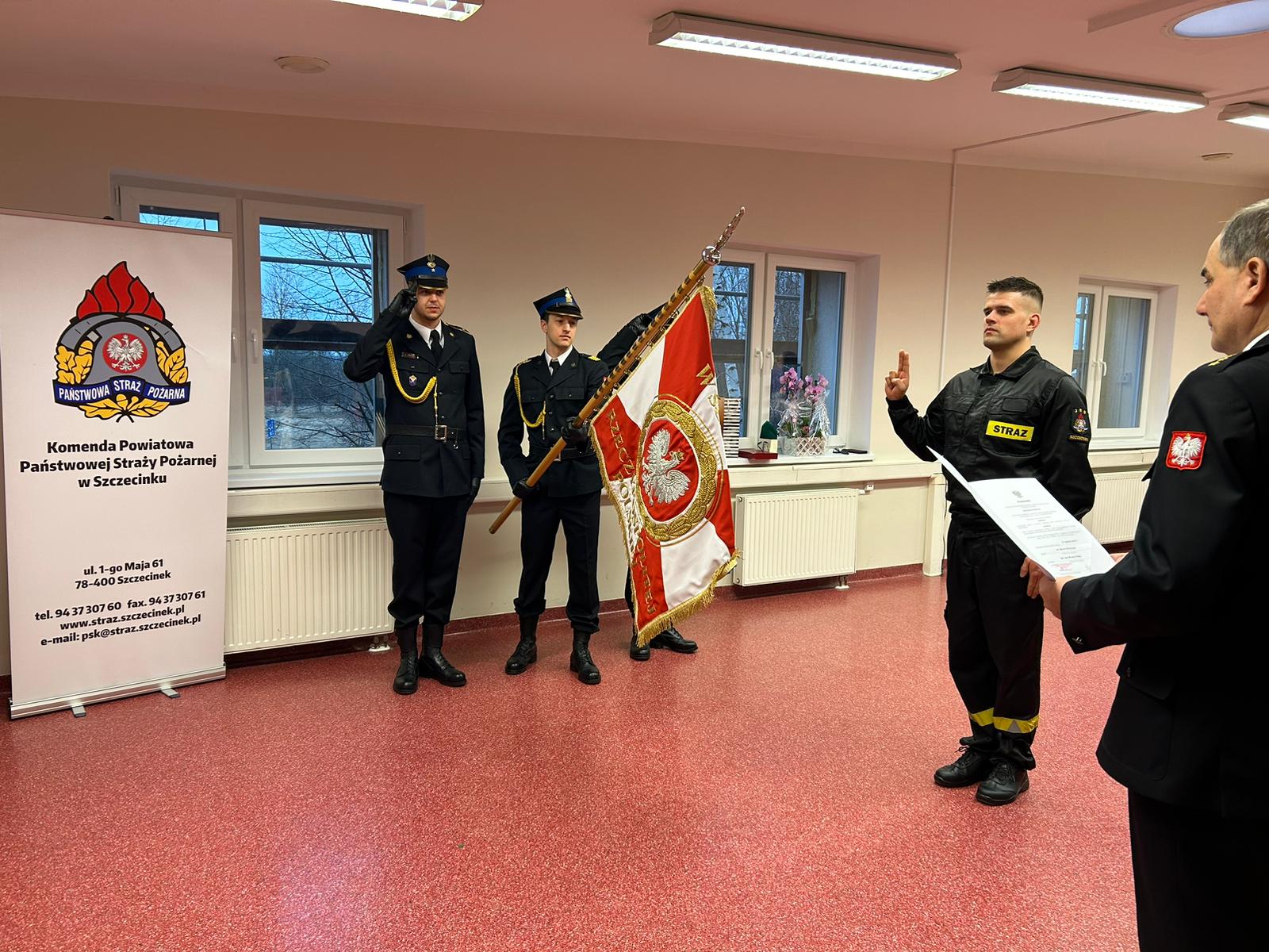 31 stycznia br. w świetlicy Komendy Powiatowej Państwowej Straży Pożarnej w Szczecinku odbyła się uroczysta zbiórka, podczas której str. Marcin Wiśniewski złożył ślubowanie na sztandar Komendy Powiatowej PSP w Szczecinku i z rąk kpt. Mirosława Śledź p. o. komendanta powiatowego PSP w Szczecinku odebrał akt ślubowania.