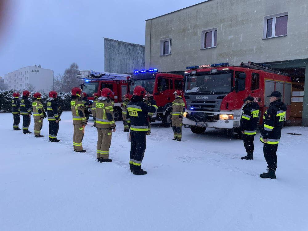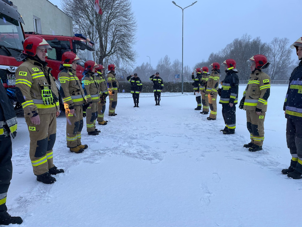 Strażacy z Komendy Powiatowej Państwowej Straży Pożarnej w Szczecinku w czasie uroczystej zmiany służby o godzinie 800 minutą ciszy uczcili tragicznie zmarłych druhów z OSP Czernikowo.
