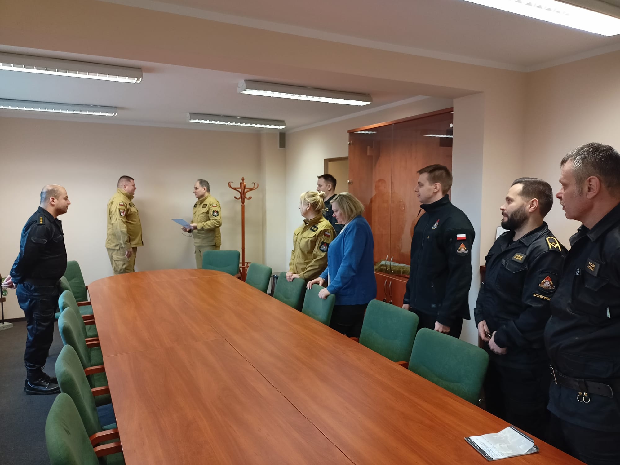 23 lutego 2024 roku p. o. Komendanta Powiatowego Państwowej Straży Pożarnej w Szczecinku kpt. Mirosław Śledź w obecności funkcjonariuszy Komendy Powiatowej PSP w Szczecinku, wręczył nagrodę jubileuszową za 20 lat pracy i służby kpt. Wojciechowi Szkwarek, naczelnikowi wydziału operacyjno-szkoleniowego.