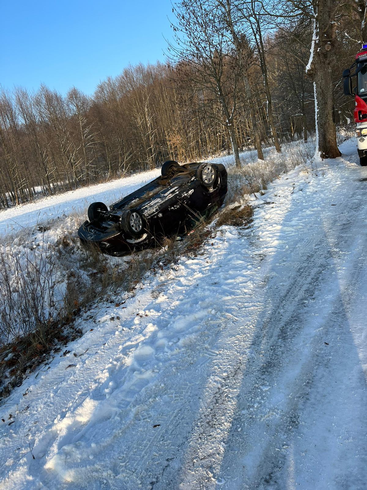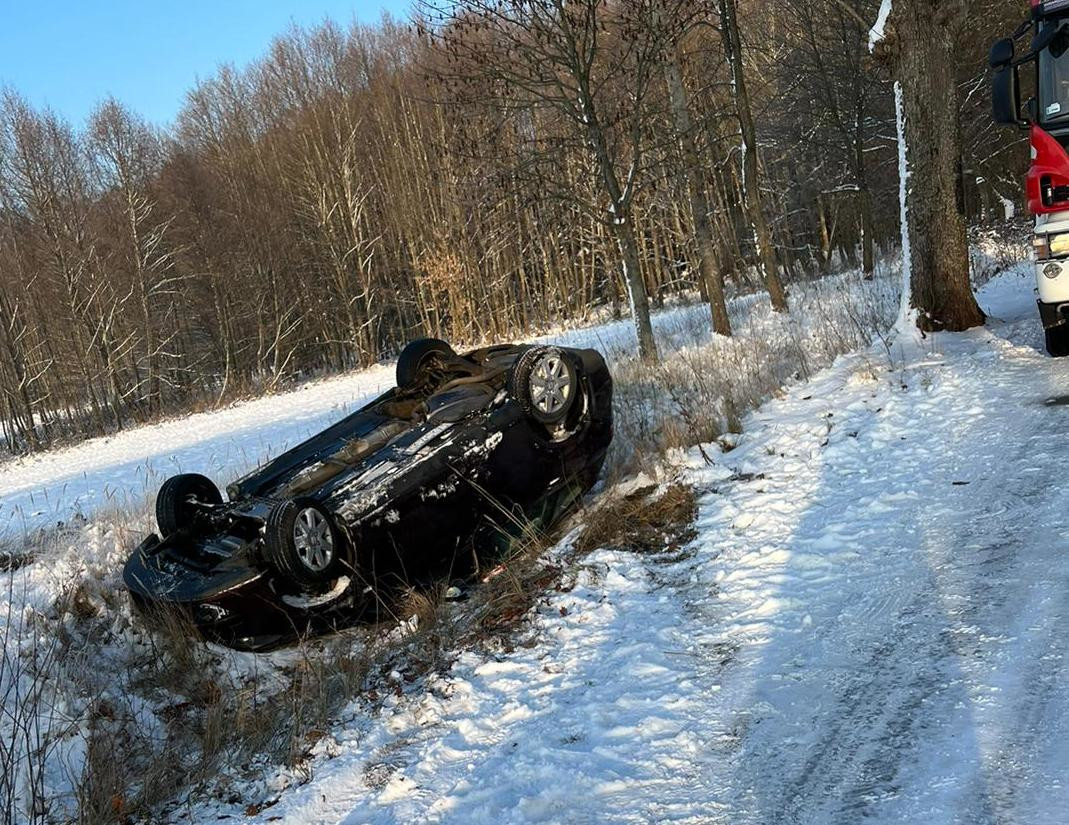 16 grudnia br. Stanowisko Kierowania Komendanta Powiatowego Państwowej Straży Pożarnej w Szczecinku otrzymało zgłoszenie o wypadku samochodu osobowego na drodze między miejscowością Białowąs - Krosino. Na miejsce zdarzenia zadysponowane zostały zastępy z jednostki ratowniczo-gaśniczej Państwowej Straży Pożarnej w Szczecinku oraz zastęp OSP Barwice i Krosino. Po przybyciu na miejsce zdarzenia zastano: pojazd leżący na dachu w rowie, dwie osoby poszkodowane w tym małe dziecko, przytomne, same opuściły pojazd. Działania zastępów ratowniczych polegały na zabezpieczeniu miejsca zdarzenia, udzieleniu pomocy przedmedycznej. Po zbadaniu przez Zespół Ratownictwa Medycznego osoby podróżujące tym pojazdem pozostały na miejscu zdarzenia.