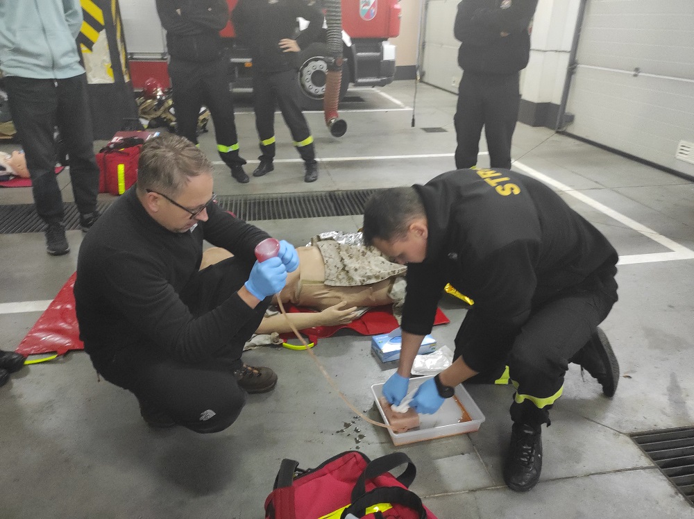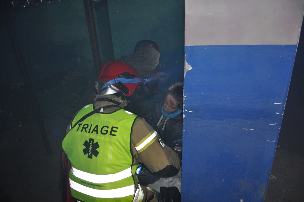 Na koniec ćwiczeń w byłej dyskotece, siły biorące udział w działaniach przemieściły się na salę konferencyjną KP PSP w Szczytnie gdzie dokonano podsumowania ćwiczeń. Dr Paweł Jastrzębski przekazał biorącym udział w ćwiczeniach zarówno pochwały jak i uwagi, nad którymi strażacy oraz studenci powinni popracować. Po zakończonej odprawie strażacy mogli skorzystać z fantomów będących na wyposażeniu mobilnego Centrum Symulacji Medycznych UWM w Olsztynie oraz specjalnie przygotowanych stanowisk ćwiczebnych z dziedziny tamowania krwotoków. Zarówno koordynator wojewódzki ratownictwa medycznego służby asp. Krzysztof Maczulski, jak i kierownik katedry ratownictwa medycznego UWM, wyrazili dalszą chęć współpracy na poziomie wspólnych ćwiczeń i warsztatów. Mamy nadzieję, że będziemy stale korzystać z tej współpracy i jednocześnie poszerzać wiedzę z zagadnień ratownictwa medycznego.